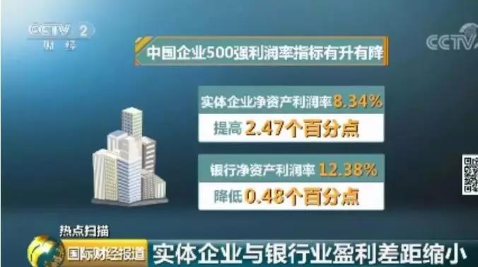 報告顯示,中國企業(yè)500強利潤率指標有升有降,其中實體企業(yè)凈資產(chǎn)利潤率為8.34%,提高了2.47個百分點;銀行凈資產(chǎn)利潤率為12.38%,降低了0.48個百分點,一升一降,實體企業(yè)與銀行凈資產(chǎn)利潤率差距進一步縮小。