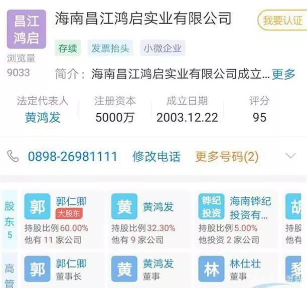 天眼查信息表現(xiàn),海南昌江鴻啟實業(yè)有限公司注冊資本為5000萬元,黃鴻發(fā)持股32.3%,為公司董事、法定代表人;而公司第一大股東、董事等人均在警方列出的黃鴻發(fā)案涉案犯法嫌疑人名單傍邊。