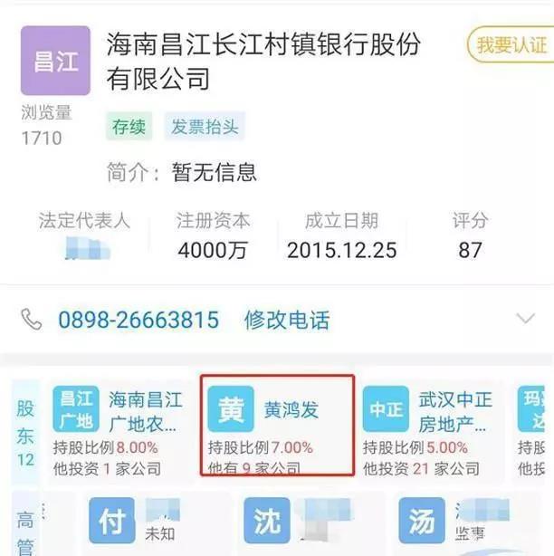 就金融業(yè)來看,鴻啟實業(yè)系海南鴻發(fā)典當(dāng)有限公司持股50%的控股股東,黃鴻發(fā)為董事長、法定代表人;別的,黃鴻發(fā)小我還持有海南昌江長江村鎮(zhèn)銀行7%的股份。