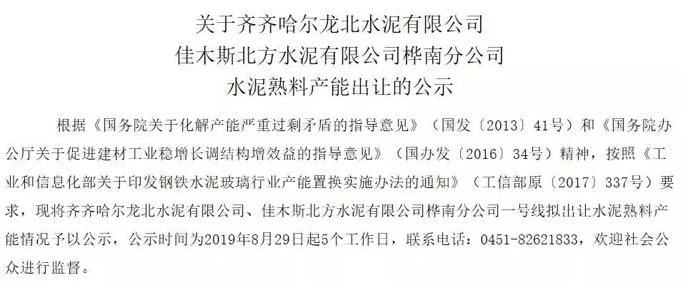 水泥人網(wǎng)消息:日前,黑龍江省工信廳發(fā)布《關(guān)于齊齊哈爾龍北水泥有限公司佳木斯北方水泥有限公司樺南分公司水泥熟料產(chǎn)能出讓的公示》稱:根據(jù)《國務(wù)院關(guān)于化解產(chǎn)能嚴(yán)重過剩矛盾的指導(dǎo)意見》(國發(fā)〔2013〕41號)和《國務(wù)院辦公廳關(guān)于促進(jìn)建材工業(yè)穩(wěn)增長調(diào)結(jié)構(gòu)增效益的指導(dǎo)意見》(國辦發(fā)〔2016〕34號)精神,按照《工業(yè)和信息化部關(guān)于印發(fā)鋼鐵水泥玻璃行業(yè)產(chǎn)能置換實施辦法的通知》(工信部原〔2017〕337號)要求,將齊齊哈爾龍北水泥有限公司、佳木斯北方水泥有限公司樺南分公司一號線擬出讓水泥熟料產(chǎn)能情況予以公示。