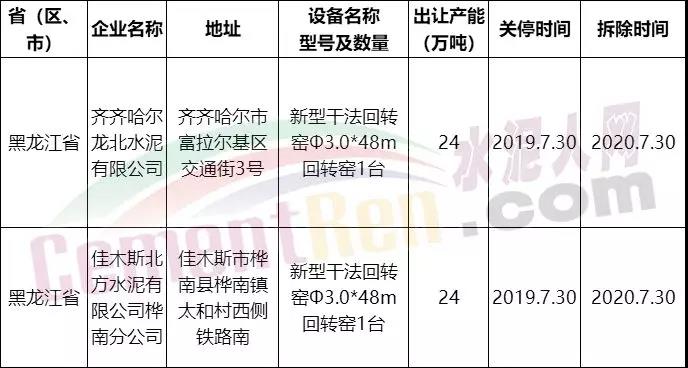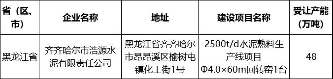 上述文件顯示,受讓產(chǎn)能企業(yè)為位于黑龍江省齊齊哈爾市昂昂溪區(qū)榆樹屯鎮(zhèn)化工街1號的齊齊哈爾市浩源水泥有限責(zé)任公司,建設(shè)項目為2500t/d水泥熟料生產(chǎn)線項目(關(guān)鍵設(shè)備為Φ4.0×60m回轉(zhuǎn)窯1臺)。出讓產(chǎn)能企業(yè)為齊齊哈爾龍北水泥有限公司和佳木斯北方水泥有限公司樺南分公司兩家企業(yè)。這兩家企業(yè)將于明年7月底前拆出退出。