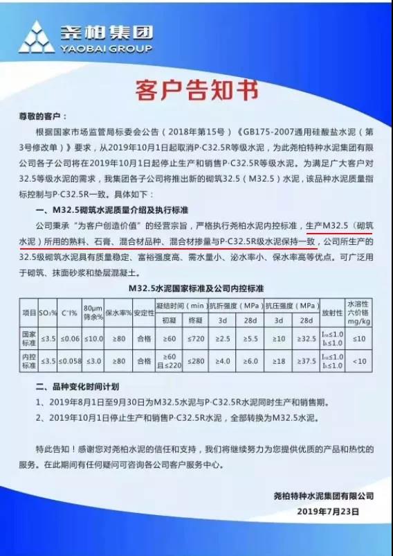堯柏集團(tuán)客戶告知書稱,堯柏集團(tuán)推出的M32.5砌筑水泥質(zhì)量指標(biāo)控制與P.C32.5R保持一致。