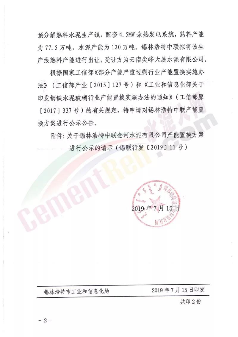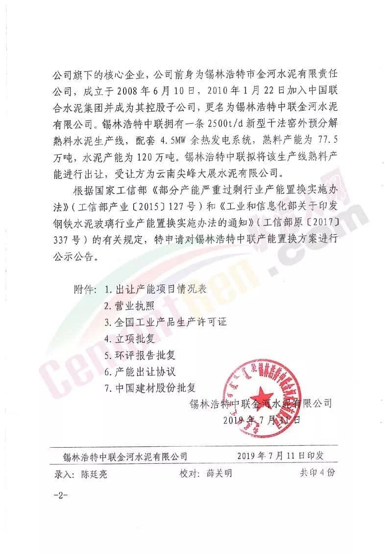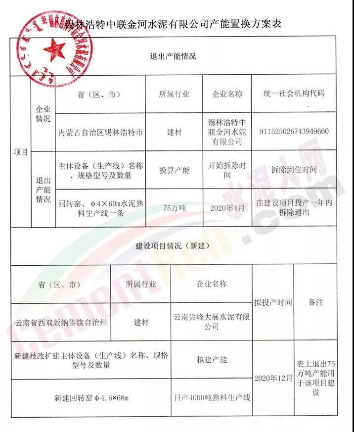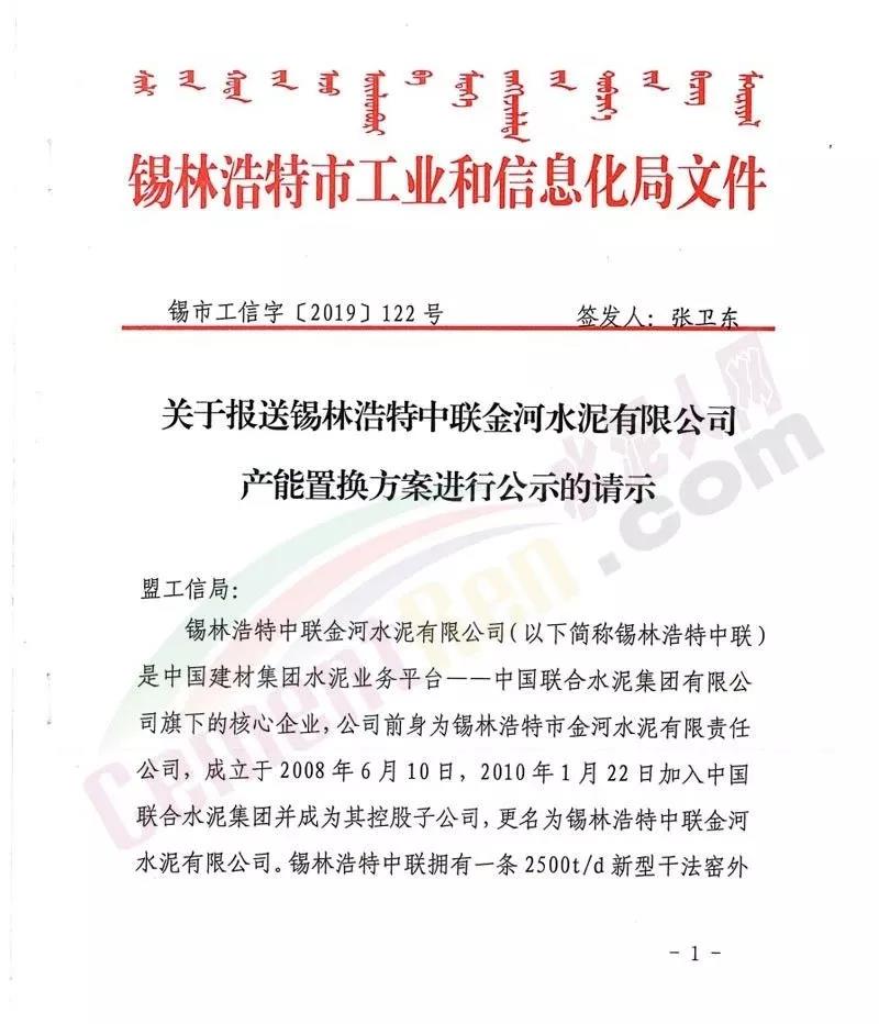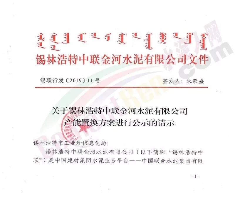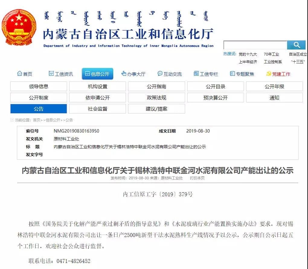 日前,內(nèi)蒙古自治區(qū)工信廳發(fā)布《關于錫林浩特中聯(lián)金河水泥有限公司產(chǎn)能出讓的公示》稱,按照《國務院關于化解產(chǎn)能嚴重過剩矛盾的指導意見》和《水泥玻璃行業(yè)產(chǎn)能置換實施辦法》要求,對錫林浩特中聯(lián)金河水泥有限公司出讓一條日產(chǎn)2500噸新型干法水泥熟料生產(chǎn)線情況予以公示,公示期自公示日起五個工作日,并歡迎社會公眾進行監(jiān)督。公示原文如下: