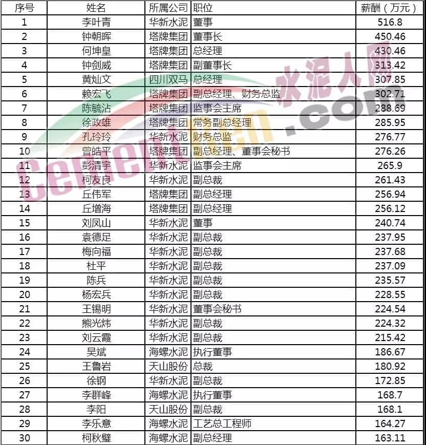 近期,各大水泥企業(yè)上市公司陸續(xù)發(fā)布2019年半年報(bào),上半年水泥企業(yè)賺得盆滿缽滿。而各大水泥集團(tuán)企業(yè)的一把手和管理層的工資收入也同期公布出來。