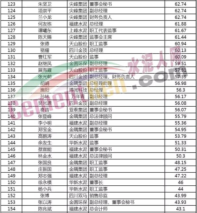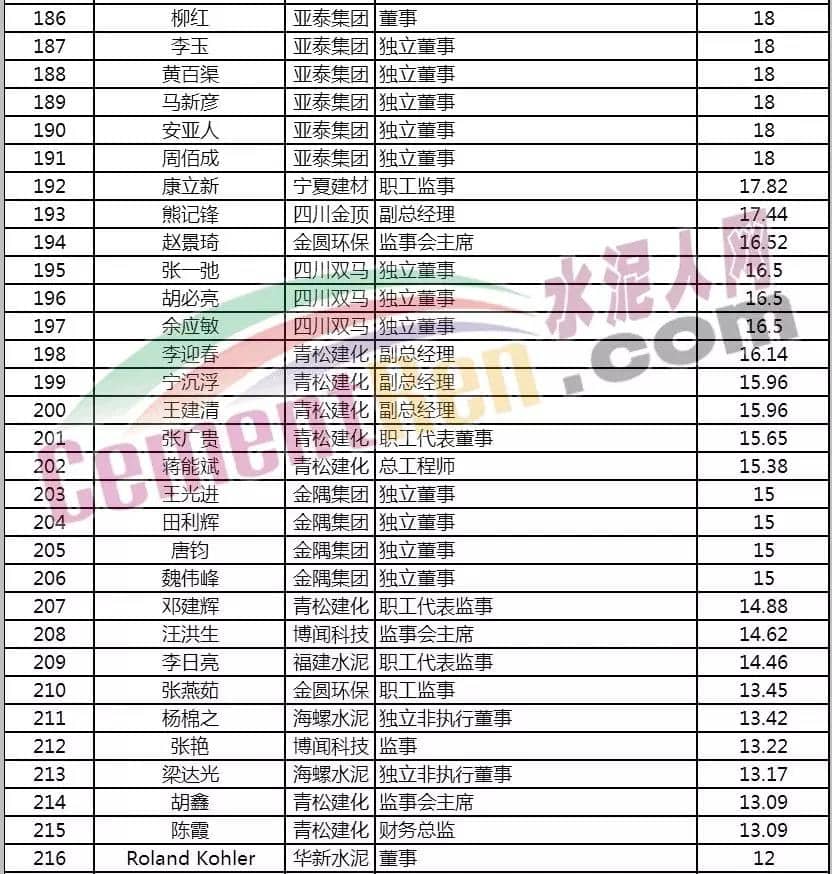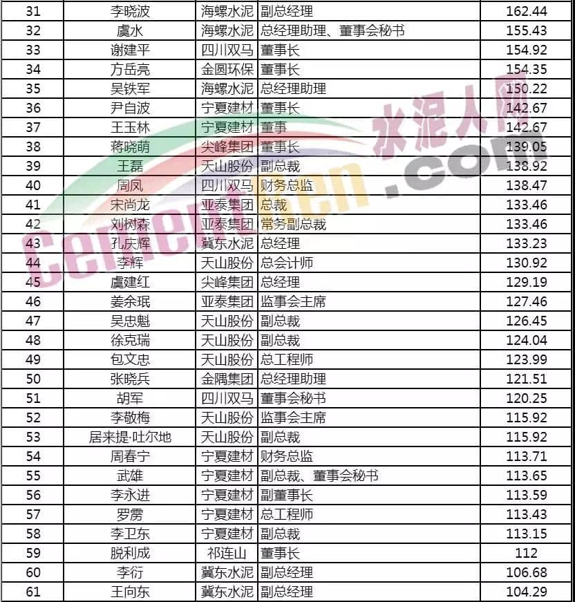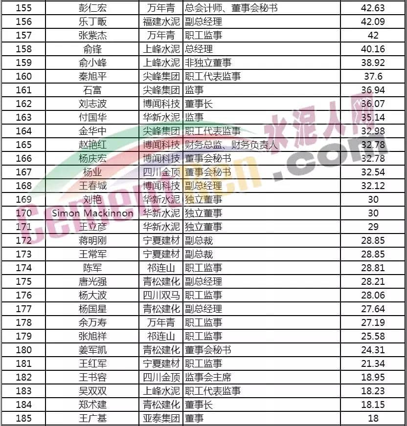 2019年水泥主板上市公司高管薪酬榜