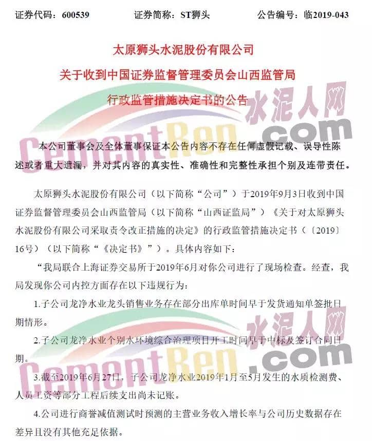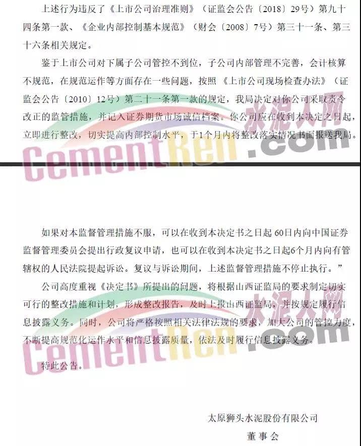 據(jù)證監(jiān)會網(wǎng)站消息,山西監(jiān)管局對太原獅頭水泥股份有限公司(簡稱ST獅頭)采取責(zé)令改正措施的決定。經(jīng)查,山西監(jiān)管局發(fā)現(xiàn)ST獅頭內(nèi)控方面存在以下違規(guī)行為: