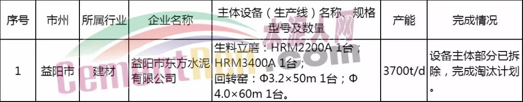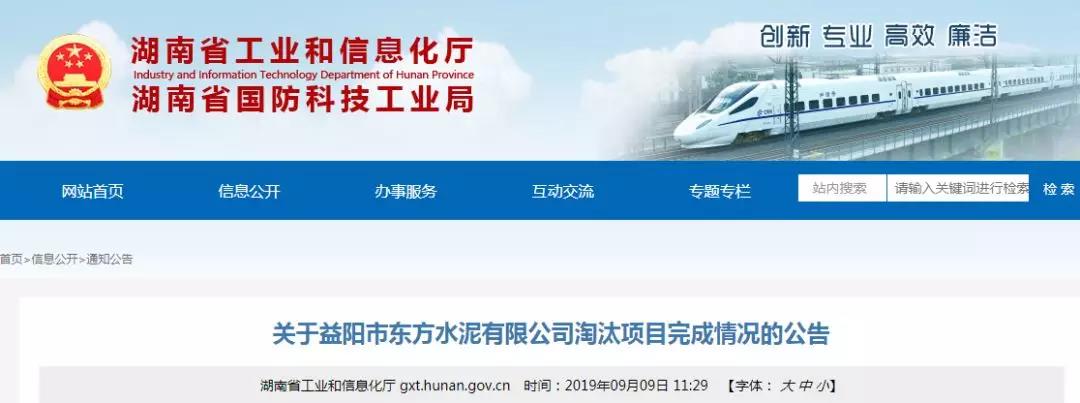 益陽市人民政府以《關(guān)于請求對益陽市東方水泥有限公司淘汰退出產(chǎn)能完成情況進(jìn)行公告的函》(益政函〔2019〕102號)提出公告申請,現(xiàn)對益陽市東方水泥有限公司淘汰項(xiàng)目完成情況予以公告。