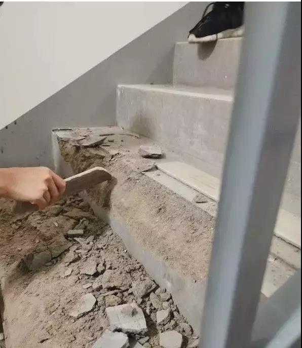 可直到最近,小區(qū)業(yè)主群里有人稱,有業(yè)主在走安全通道樓梯時(shí),一腳將水泥臺(tái)階踩碎,險(xiǎn)些摔倒,讓大家一下警覺了起來。“要知道,樓梯臺(tái)階可是水泥的呀,正常人上下臺(tái)階,怎么可能把水泥樓梯給踩碎了。這未免也太嚇人了吧。”一位業(yè)主說,“因?yàn)榘踩ǖ榔綍r(shí)大家也沒特別注意,一聽到這消息,業(yè)主群里就炸開了鍋。隨后大伙就去試了試,真的是拿根棍子隨便敲幾下,那水泥臺(tái)階就嘩啦啦的掉渣子。這工程明顯就是豆腐渣。”