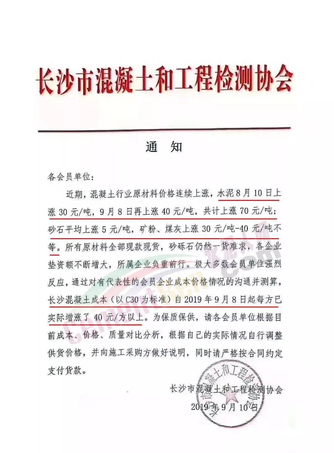 據(jù)水泥人網(wǎng)了解,本周二(17日)安徽六安地區(qū)混凝土行價(jià)格出現(xiàn)小幅上漲5元/方,市區(qū)主流品牌C30混凝土含稅非泵送價(jià)格在565-575元/方;湖南衡陽原料價(jià)格上漲,混凝土隨之上浮5-10元/方,C30非泵市場報(bào)價(jià)415-435元/方。除上述區(qū)域外,近期華東區(qū)域混凝土價(jià)格亦出現(xiàn)小幅上漲,12日前后山東濱州、淄博以及安徽蕪湖及銅陵混凝土價(jià)格小幅上調(diào)5元/方;華中湖南長沙部分區(qū)域上漲40元/方。詳情如下:日前,湖南省長沙市混凝土和工程檢測協(xié)會發(fā)布通知稱,近期長沙混凝土行業(yè)原材料價(jià)格連續(xù)上漲,水泥8月10日上漲30元/噸,9月8日再上漲40元/噸,共計(jì)上漲70元/噸;砂石平均上漲5元/噸,礦粉、煤灰上漲30-40元每噸不等。所有原材料全部現(xiàn)款現(xiàn)貨,砂礫石仍然一貨難求,各砼企墊資額不斷增大,所屬企業(yè)負(fù)重前行。經(jīng)大多數(shù)會員單位強(qiáng)烈反映,通過對有代表性的會員企業(yè)成本價(jià)格情況的溝通并測算,長沙混凝土成本(以C30為標(biāo)準(zhǔn))自2019年9月8日起每方已實(shí)際增漲了40元以上。為了在保質(zhì)保量,建議各單位對目前成本,價(jià)格,質(zhì)量對比分析。根據(jù)自己的實(shí)際情況自行調(diào)整供貨價(jià)格,并向施工采購方做好說明,同時(shí)請嚴(yán)格按照合同約定支付貨款。