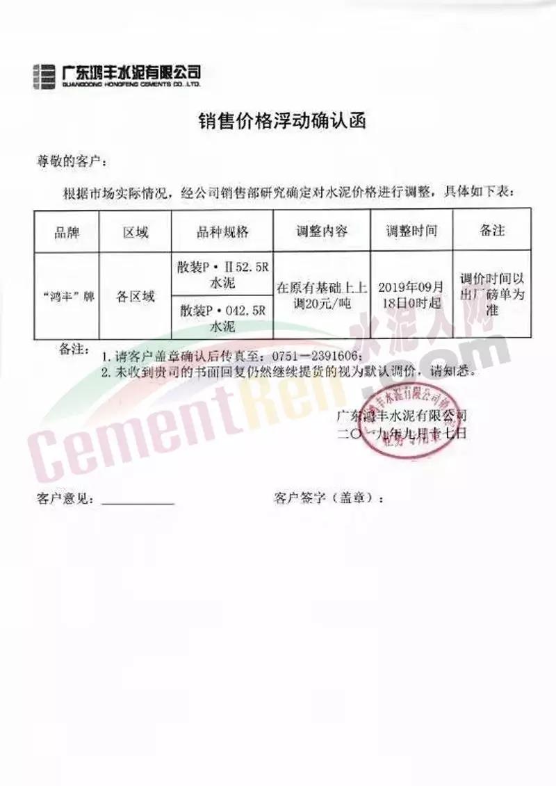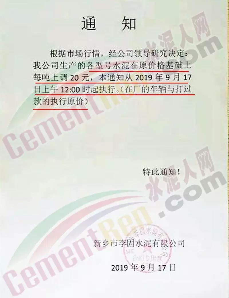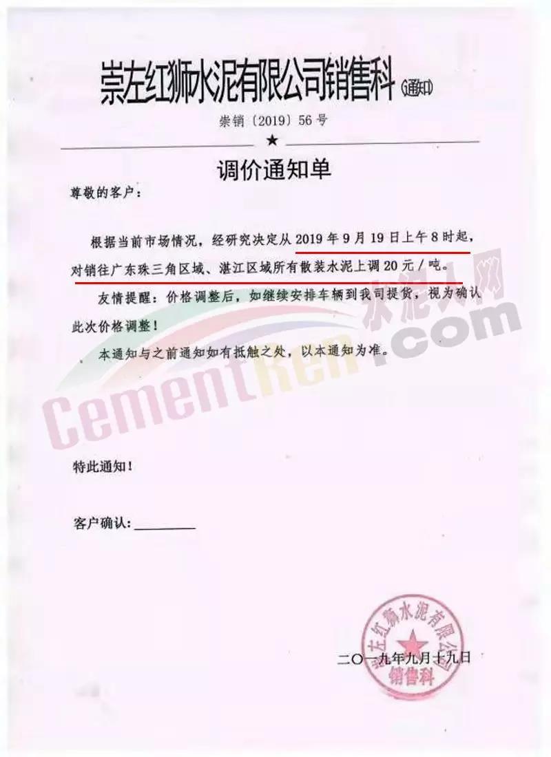 水泥人網(wǎng)消息:日前,崇左紅獅水泥銷售科通知:自今日(9月19日)上午8時(shí)起對銷往廣東珠三角、湛江區(qū)域區(qū)域所有散裝水泥上調(diào)20元/噸。