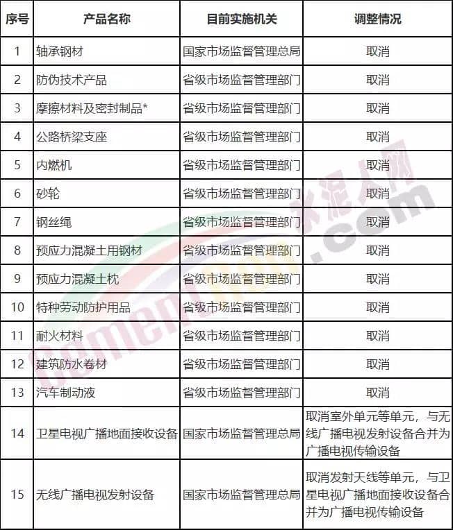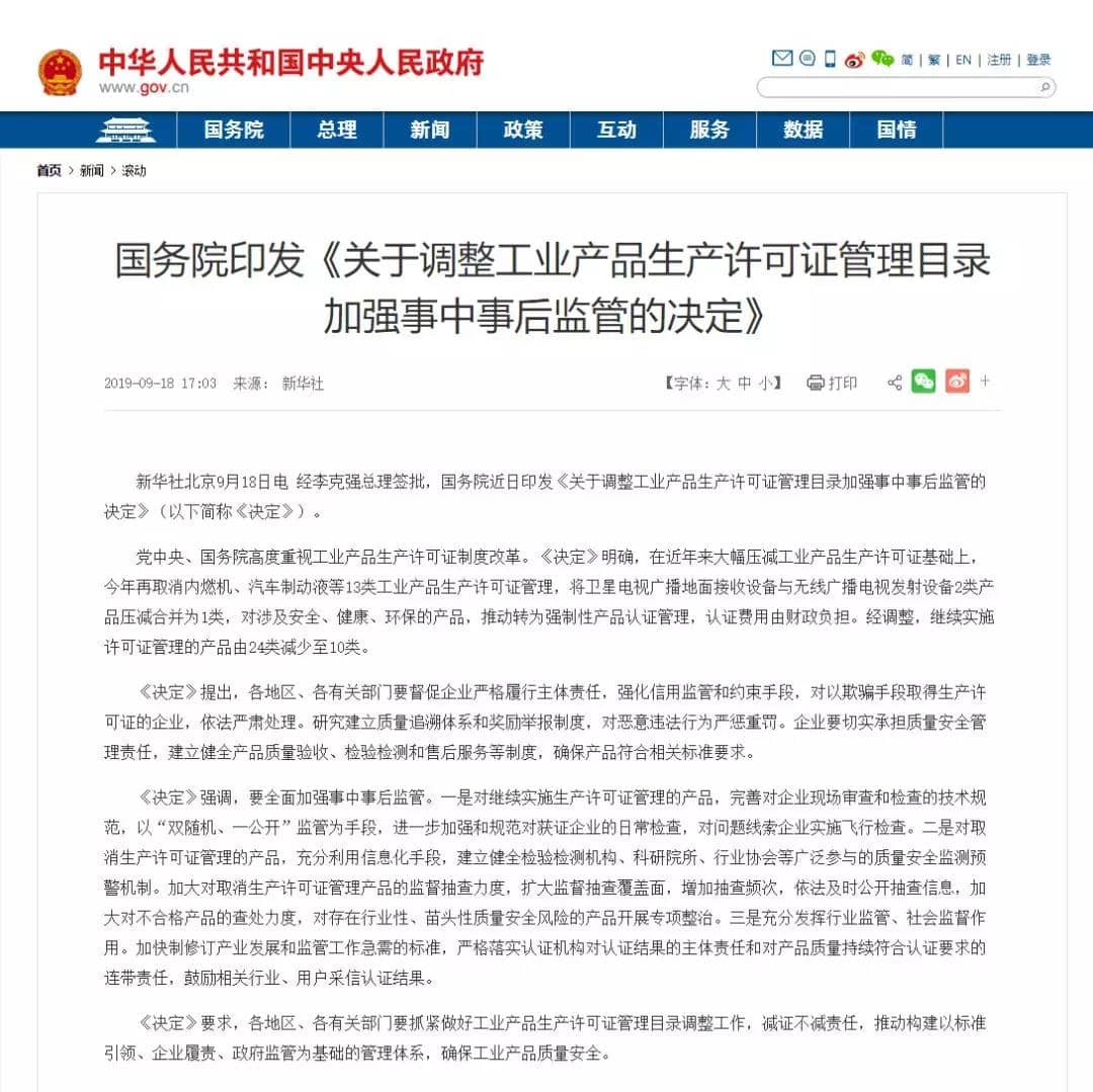 文件稱:黨中央、國(guó)務(wù)院高度重視工業(yè)產(chǎn)品生產(chǎn)許可證制度改革?!稕Q定》明確,在近年來大幅壓減工業(yè)產(chǎn)品生產(chǎn)許可證基礎(chǔ)上,今年再取消內(nèi)燃機(jī)、汽車制動(dòng)液等13類工業(yè)產(chǎn)品生產(chǎn)許可證管理,將衛(wèi)星電視廣播地面接收設(shè)備與無線廣播電視發(fā)射設(shè)備2類產(chǎn)品壓減合并為1類,對(duì)涉及安全、健康、環(huán)保的產(chǎn)品,推動(dòng)轉(zhuǎn)為強(qiáng)制性產(chǎn)品認(rèn)證管理,認(rèn)證費(fèi)用由財(cái)政負(fù)擔(dān)。經(jīng)調(diào)整,繼續(xù)實(shí)施許可證管理的產(chǎn)品由24類減少至10類。《決定》提出,各地區(qū)、各有關(guān)部門要督促企業(yè)嚴(yán)格履行主體責(zé)任,強(qiáng)化信用監(jiān)管和約束手段,對(duì)以欺騙手段取得生產(chǎn)許可證的企業(yè),依法嚴(yán)肅處理。研究建立質(zhì)量追溯體系和獎(jiǎng)勵(lì)舉報(bào)制度,對(duì)惡意違法行為嚴(yán)懲重罰。企業(yè)要切實(shí)承擔(dān)質(zhì)量安全管理責(zé)任,建立健全產(chǎn)品質(zhì)量驗(yàn)收、檢驗(yàn)檢測(cè)和售后服務(wù)等制度,確保產(chǎn)品符合相關(guān)標(biāo)準(zhǔn)要求?!稕Q定》強(qiáng)調(diào),要全面加強(qiáng)事中事后監(jiān)管。一是對(duì)繼續(xù)實(shí)施生產(chǎn)許可證管理的產(chǎn)品,完善對(duì)企業(yè)現(xiàn)場(chǎng)審查和檢查的技術(shù)規(guī)范,以“雙隨機(jī)、一公開”監(jiān)管為手段,進(jìn)一步加強(qiáng)和規(guī)范對(duì)獲證企業(yè)的日常檢查,對(duì)問題線索企業(yè)實(shí)施飛行檢查。二是對(duì)取消生產(chǎn)許可證管理的產(chǎn)品,充分利用信息化手段,建立健全檢驗(yàn)檢測(cè)機(jī)構(gòu)、科研院所、行業(yè)協(xié)會(huì)等廣泛參與的質(zhì)量安全監(jiān)測(cè)預(yù)警機(jī)制。加大對(duì)取消生產(chǎn)許可證管理產(chǎn)品的監(jiān)督抽查力度,擴(kuò)大監(jiān)督抽查覆蓋面,增加抽查頻次,依法及時(shí)公開抽查信息,加大對(duì)不合格產(chǎn)品的查處力度,對(duì)存在行業(yè)性、苗頭性質(zhì)量安全風(fēng)險(xiǎn)的產(chǎn)品開展專項(xiàng)整治。三是充分發(fā)揮行業(yè)監(jiān)管、社會(huì)監(jiān)督作用。加快制修訂產(chǎn)業(yè)發(fā)展和監(jiān)管工作急需的標(biāo)準(zhǔn),嚴(yán)格落實(shí)認(rèn)證機(jī)構(gòu)對(duì)認(rèn)證結(jié)果的主體責(zé)任和對(duì)產(chǎn)品質(zhì)量持續(xù)符合認(rèn)證要求的連帶責(zé)任,鼓勵(lì)相關(guān)行業(yè)、用戶采信認(rèn)證結(jié)果。