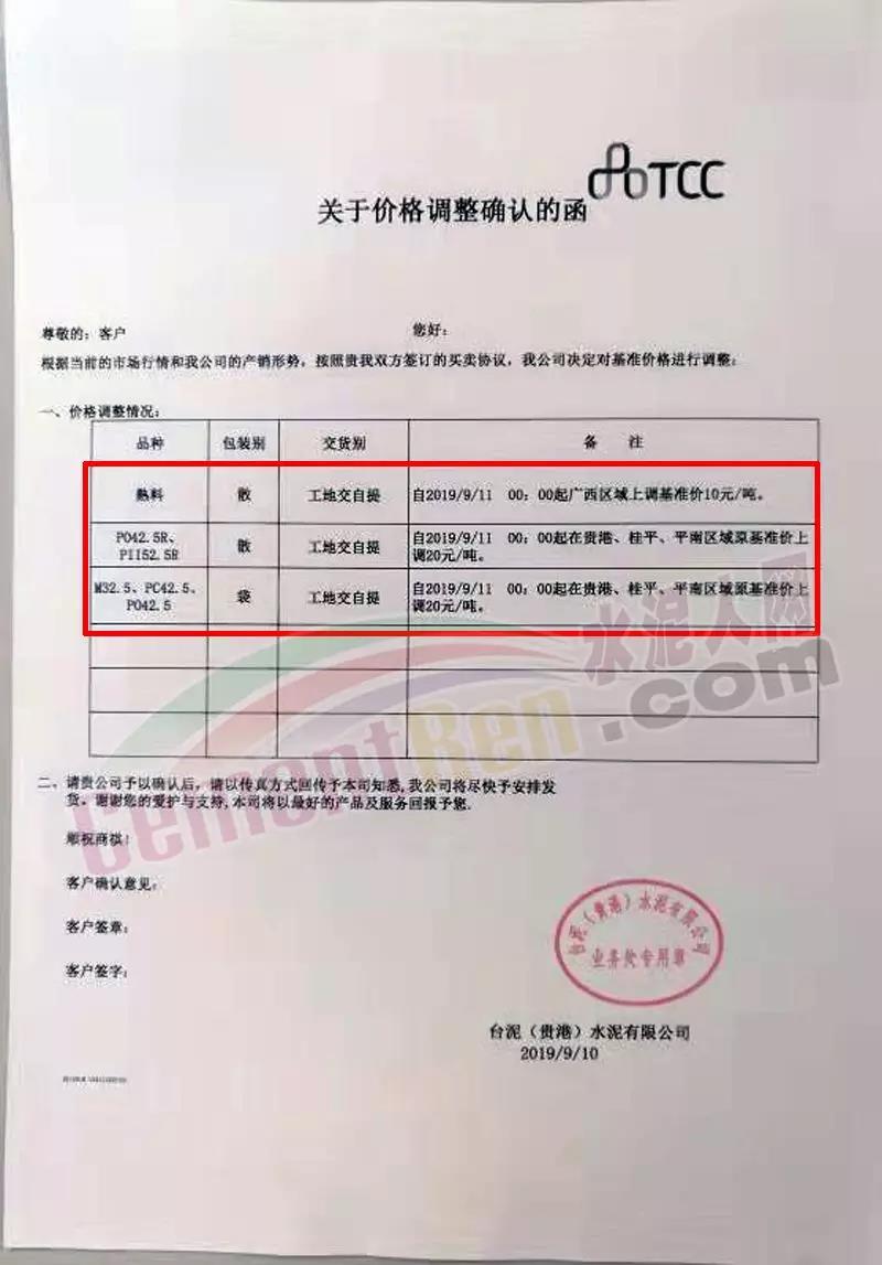 臺泥(貴港)水泥有限公司自9月11日零時起熟料上調(diào)10元/噸。PO42.5以及上標(biāo)號水泥上調(diào)20元/噸。