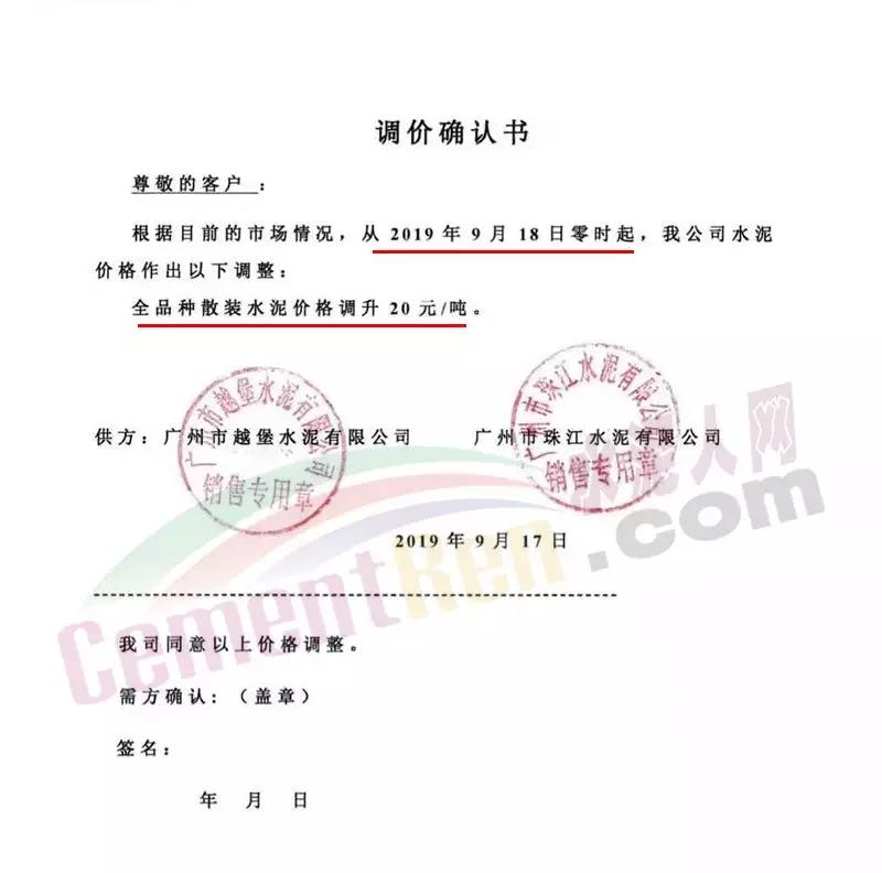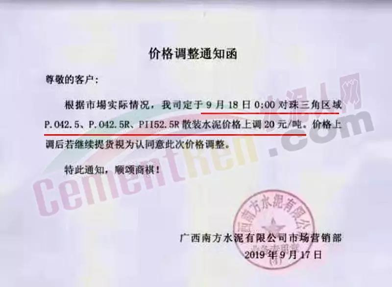 廣西南方水泥有限公司通知9月18日0時起對珠三角區(qū)域PO42.5及以上高標(biāo)號散裝水泥價格上調(diào)20元/噸。