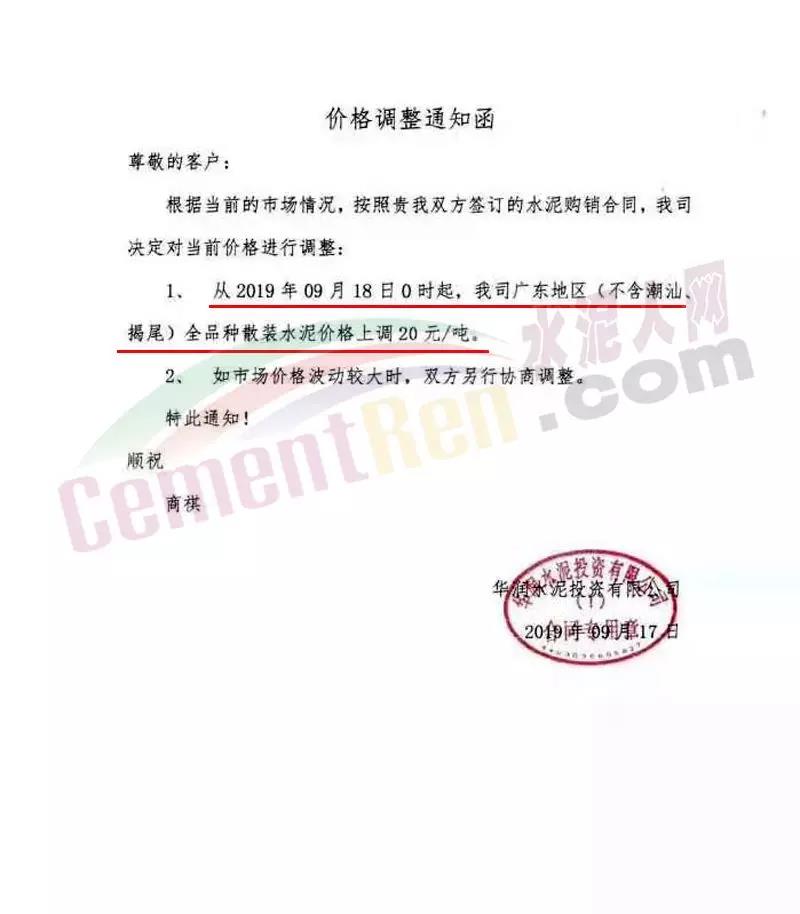 華潤水泥投資有限公司通知 從9月18日0時起廣東地區(qū)(不含潮汕、揭尾)全品種散裝水泥價格上調(diào)20元/噸。