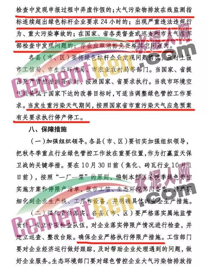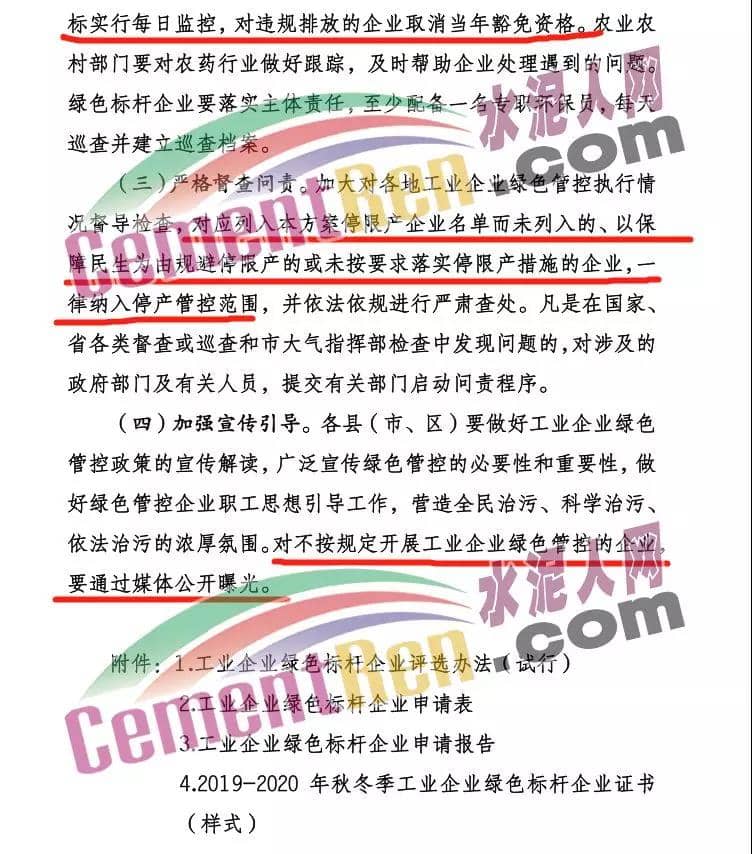 水泥人網(wǎng)消息:日前,山東省濟寧市發(fā)布《濟寧市 2019-2020 年秋冬季工業(yè)企業(yè)綠色管控實施方案(試行)》稱,為貫徹落實《京津冀及周邊地區(qū) 2019-2020年秋冬季大氣污染綜合治理攻堅行動方案》和省 、市秋冬季大氣污染防治方案 ,按照市委、市政府要求,深入推進(jìn) 2019-2020 年秋冬季 工業(yè)企業(yè)季節(jié)性生產(chǎn)調(diào)控 ,持續(xù)改善區(qū)域空氣質(zhì)量,制定本實施方案。 該方案的實施范圍包括:實施范圍建材、焦化、鑄造、 炭 素、玻璃 、涉 涉 VOCs 、各類 鍋爐等行業(yè)企業(yè)。建材行業(yè)主要包括水泥 (含粉磨站) 、陶瓷、磚瓦、石灰 、玻璃棉、石膏板、巖棉、礦物棉等行業(yè)企業(yè)。涉 s VOCs 行業(yè)主要針對涉 s VOCs 排放的制藥工業(yè)、農(nóng)藥工業(yè)、化工、工業(yè)涂裝、家具制造、印刷等行業(yè)企業(yè)?! ?a href="http://m.jnyqt.com/news/list_2.html" target="_blank" class="keylink">水泥企業(yè)2019年10月1日至2020年3月31日停限產(chǎn) 實施時間為:工業(yè)企業(yè)秋冬季綠色管控實施時間原則上為秋冬季2019年10月1日至 2020年3月31日。根據(jù)秋冬季空氣質(zhì)量改善目標(biāo)和秋冬季重污染天氣預(yù)測情況,可適當(dāng)縮短或延長各行業(yè)綠色管控實施時間。 禁止一刀切,綠色標(biāo)桿企業(yè)減免,為納入的企業(yè)執(zhí)行最嚴(yán)停限產(chǎn) 據(jù)水泥人網(wǎng)了解,該方案要求對行業(yè)污染排放績效水平明顯好于同行業(yè)其他企業(yè)的工業(yè)企業(yè),按照《工業(yè)企業(yè)綠色標(biāo)桿企業(yè)評選辦法(試行)》(附件1 1 )申請綠色標(biāo)桿企業(yè),經(jīng)屬地政府批準(zhǔn)后發(fā)放綠色標(biāo)桿企業(yè)證書,可按規(guī)定實行不限產(chǎn)或少限產(chǎn)?! 〗ú?水泥熟料、粉磨站、陶瓷、磚瓦、 石灰 、玻璃棉、石膏板、巖棉、礦物棉)、焦化、鑄造、玻璃、炭素、各類鍋爐、涉VOCs等行業(yè)所有企業(yè)要全部納入管控清單,凡是未納入的,采暖季期間按同行業(yè)最嚴(yán)標(biāo)準(zhǔn)執(zhí)行停限產(chǎn)?! ζ髽I(yè)落實停限產(chǎn)情況進(jìn)行檢查,并建立巡查、整改臺賬。確保企業(yè)嚴(yán)格執(zhí)行停限產(chǎn)措施;對應(yīng)列入本方案停限產(chǎn)企業(yè)名單而未列入的、以保障民生為由規(guī)避停限產(chǎn)的或未按要求落實停限產(chǎn)措施的企業(yè),一律納入停產(chǎn)管控范圍,并依法依規(guī)進(jìn)行嚴(yán)肅查處。 采暖季期間(2019年11月15日—2020年3月15日),滿足A級的企業(yè)可不予限產(chǎn),滿足B級的企業(yè) 在停產(chǎn)不少于連續(xù)續(xù)1個月(12月或1月) ,其他情形的企業(yè)在停產(chǎn)不少于連續(xù)3個月(11月15日 —2月15日或12月15日—3月15日,鼓勵縣市區(qū)分批輪流停產(chǎn))。各 縣(市、區(qū))可根據(jù)目標(biāo)任務(wù)完成情況和管理實際加嚴(yán)要求。如山東省水泥協(xié)會出臺更嚴(yán)停限產(chǎn)要求,從嚴(yán)執(zhí)行 ?! 〔膳酒陂g(2019年11月15日—2020年3月15日),粉磨站停產(chǎn)不少于連續(xù)2 個月(11月15日—1月15日或1月15 日—3月15日,鼓勵縣市區(qū)分批輪流停產(chǎn))。各縣(市、區(qū))可根據(jù)目標(biāo)任務(wù)完成情況和管理實際加嚴(yán)要求。如山東省水泥協(xié)會出臺更嚴(yán)停限產(chǎn)要求,從嚴(yán)執(zhí)行 。方案全文如下: