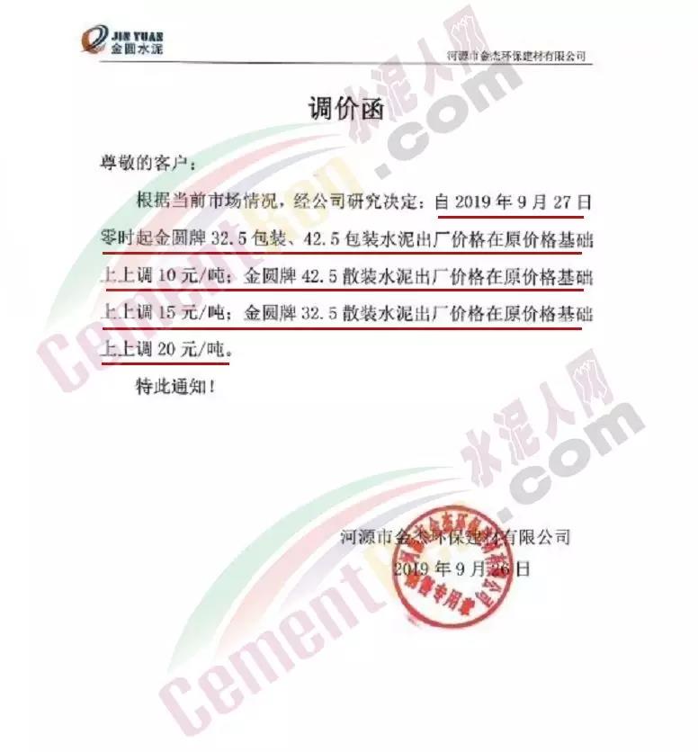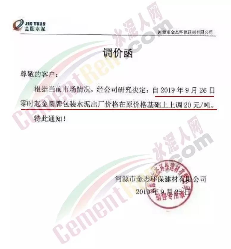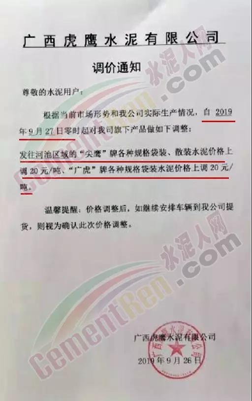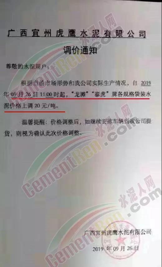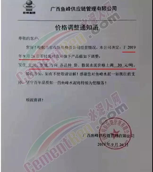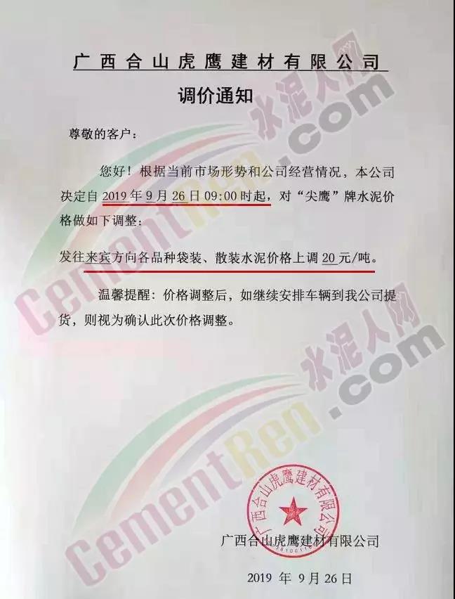 根據當前市場形勢及我司生產情況,我公司決定于2019年9月26日8時,上調所有品種袋裝、散裝水泥價格30元/噸。價格上調以我司出廠過磅時間為準,如您繼續(xù)安排提貨,則視為認同此次價格調整。順祝商祺!