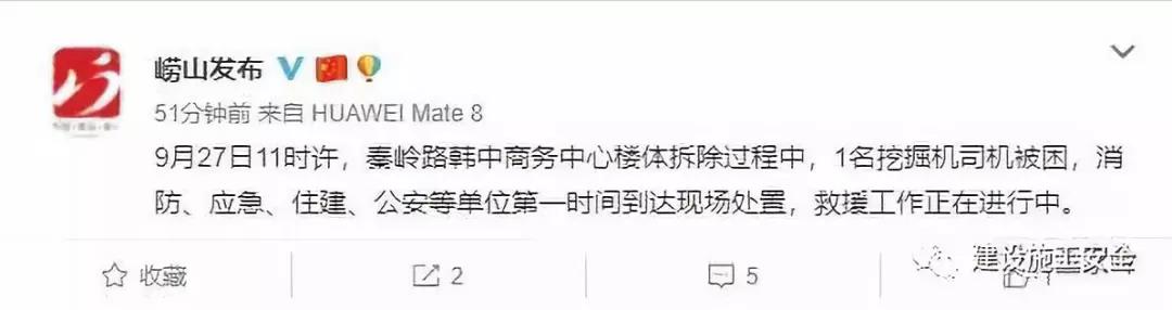 微博內(nèi)容截圖據(jù)嶗山發(fā)布官方微博發(fā)布消息稱,9月27日11時(shí)許,青島市嶗山區(qū)秦嶺路韓中商務(wù)中心樓體拆除過(guò)程中,1名挖掘機(jī)司機(jī)被困,消防、應(yīng)急、住建、公安等單位第一時(shí)間到達(dá)現(xiàn)場(chǎng)處置,救援工作正在進(jìn)行中。 據(jù)知情人透露,該項(xiàng)目的拆除工作是由和達(dá)集團(tuán)進(jìn)行施工,現(xiàn)場(chǎng)突發(fā)意外整個(gè)樓體瞬間崩塌,挖掘機(jī)被埋。事故現(xiàn)場(chǎng)正進(jìn)行多方救援