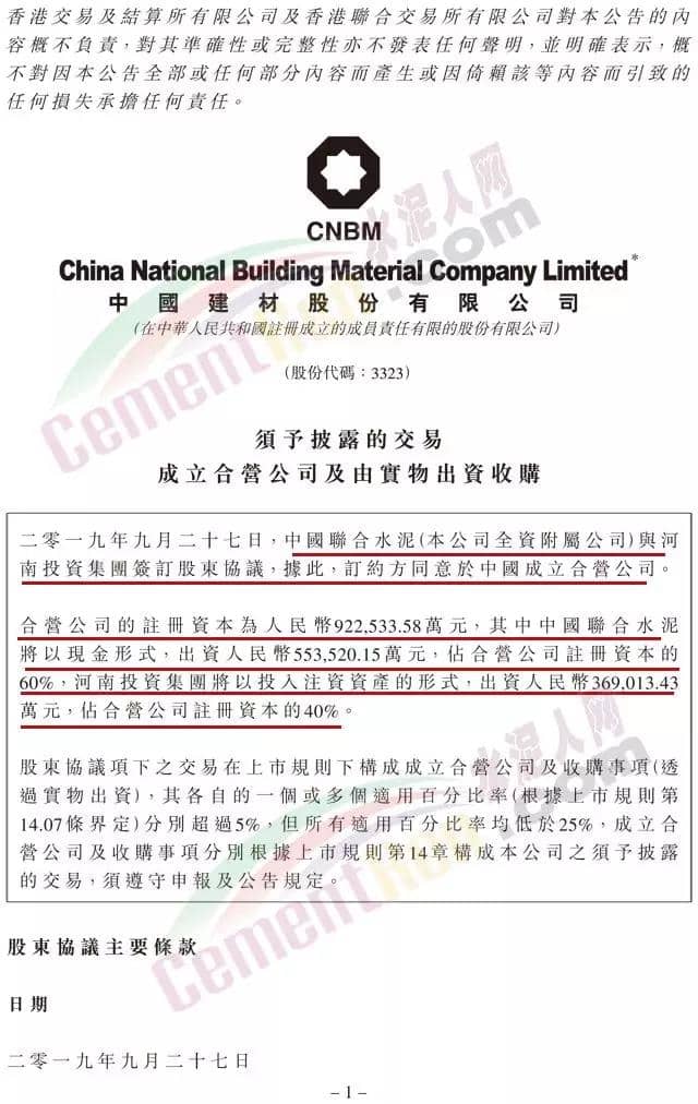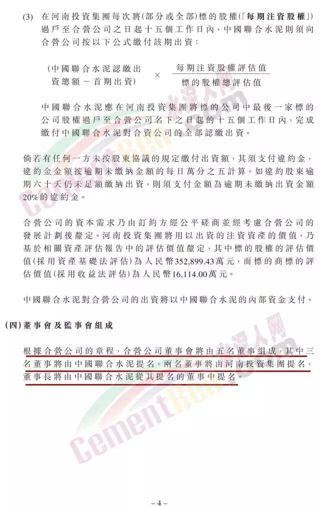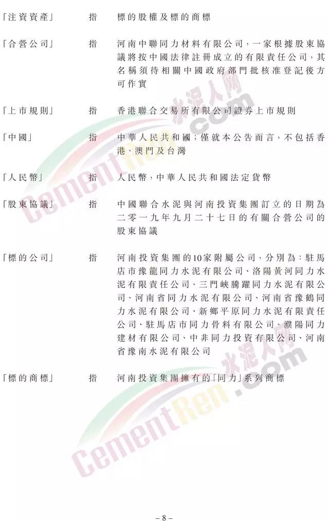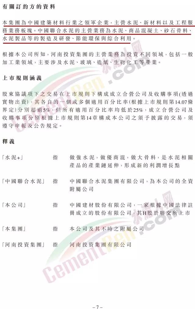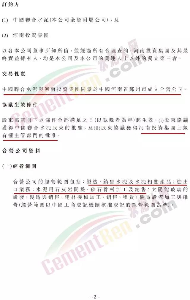 合營公司的營業(yè)期限為50年。經(jīng)合營公司持有三分之二以上表決權(quán)的股東同意可延長公司的營業(yè)期限。合營公司業(yè)務(wù)包括制造、銷售水泥及水泥相關(guān)產(chǎn)品,以及進出口業(yè)務(wù)等。