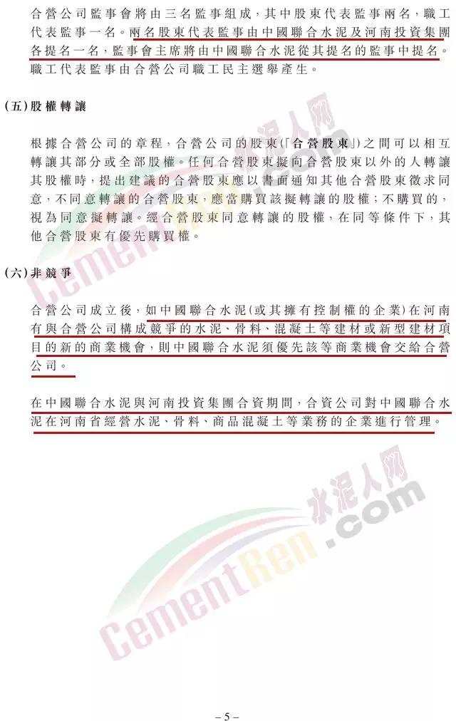 合營公司成立后,如中國聯(lián)合水泥(或其擁有控制權(quán)的企業(yè))在河南有與合營公司構(gòu)成競爭的水泥、骨料、混凝土等建材或新型建材項目的新的商業(yè)機會,則中國聯(lián)合水泥須優(yōu)先該等商業(yè)機會交給合營公司。在中國聯(lián)合水泥與河南投資集團合資期間,合資公司對中國聯(lián)合水泥在河南省經(jīng)營水泥、骨料、商品混凝土等業(yè)務(wù)的企業(yè)進行管理。