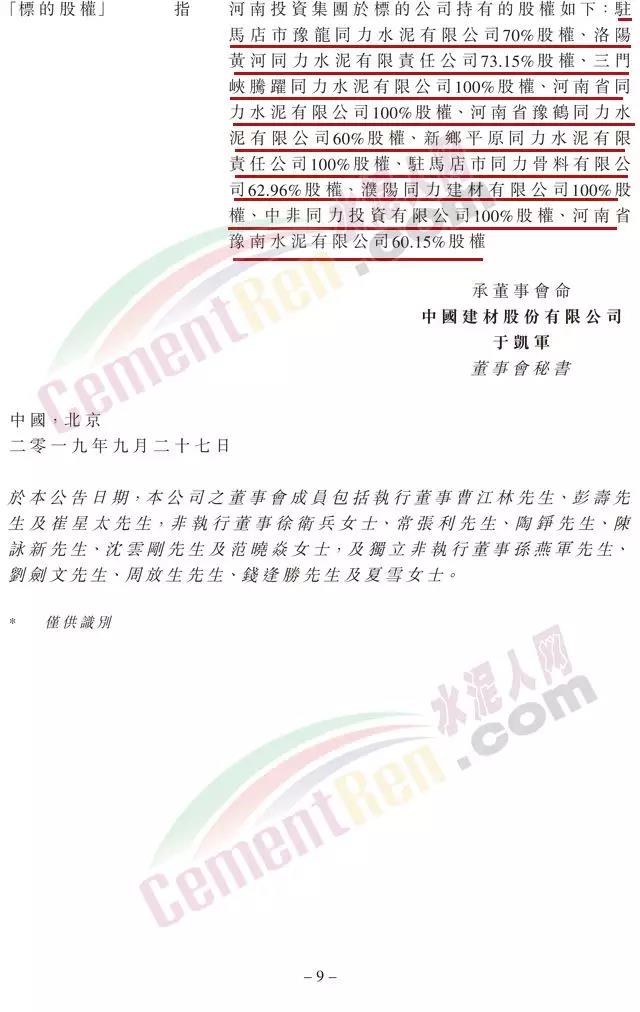 河南省內(nèi)大型水泥企業(yè)集團區(qū)域分布相對獨立,中國聯(lián)合水泥的附屬公司與河南投資集團屬下的“同力”系列水泥集團各自的業(yè)務(wù)現(xiàn)分布在河南省的不同區(qū)域。該公司預(yù)期股東協(xié)議項下之交易將有利于強化中國聯(lián)合水泥于河南省的地位,并將整合雙方資源,主要體現(xiàn)于成本下降、進一步發(fā)揮企業(yè)優(yōu)勢及配合集團發(fā)展“水泥+”的戰(zhàn)略,在河南省建設(shè)集水泥、商混、骨料和水泥制品為一體的大型建材產(chǎn)業(yè)集團。交易亦符合河南省人民政府鼓勵區(qū)內(nèi)重點水泥企業(yè)進行重組以調(diào)整產(chǎn)業(yè)結(jié)構(gòu)的政策。