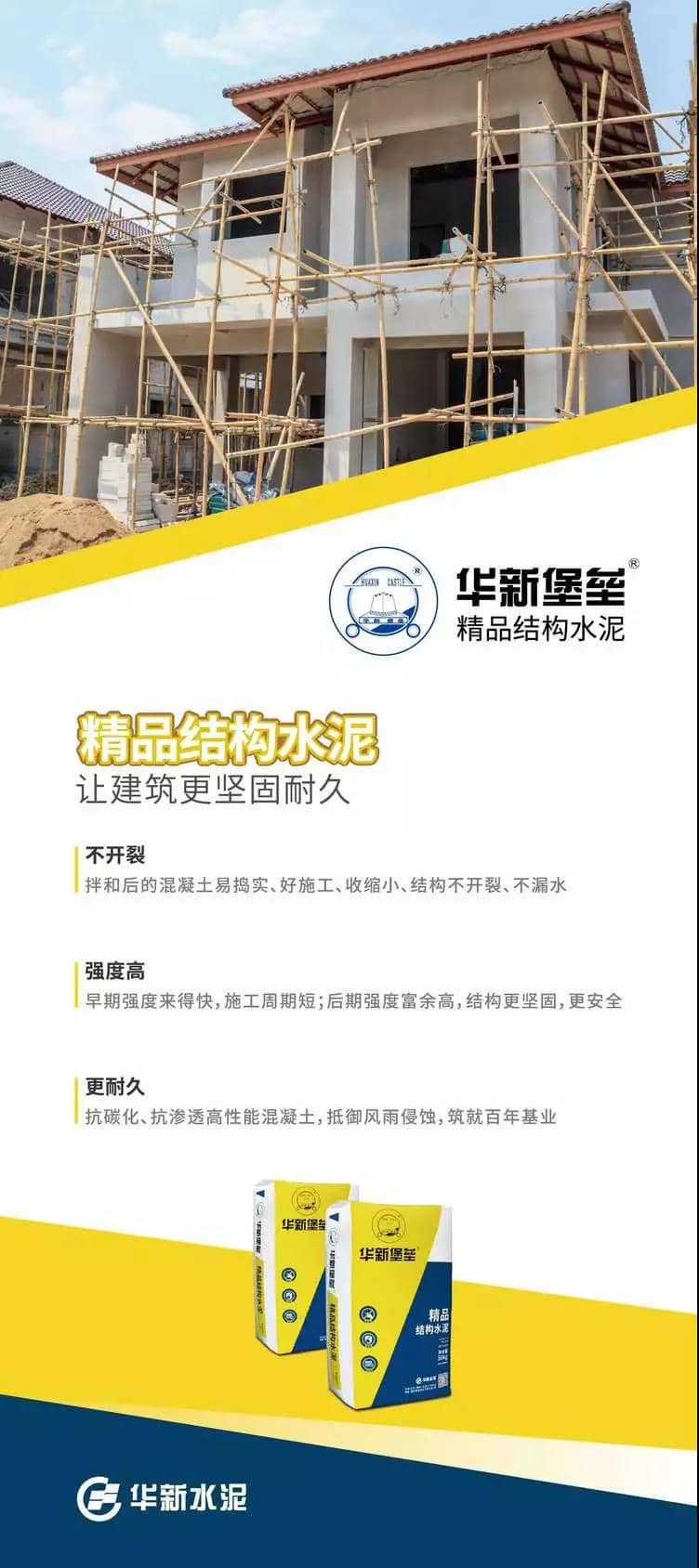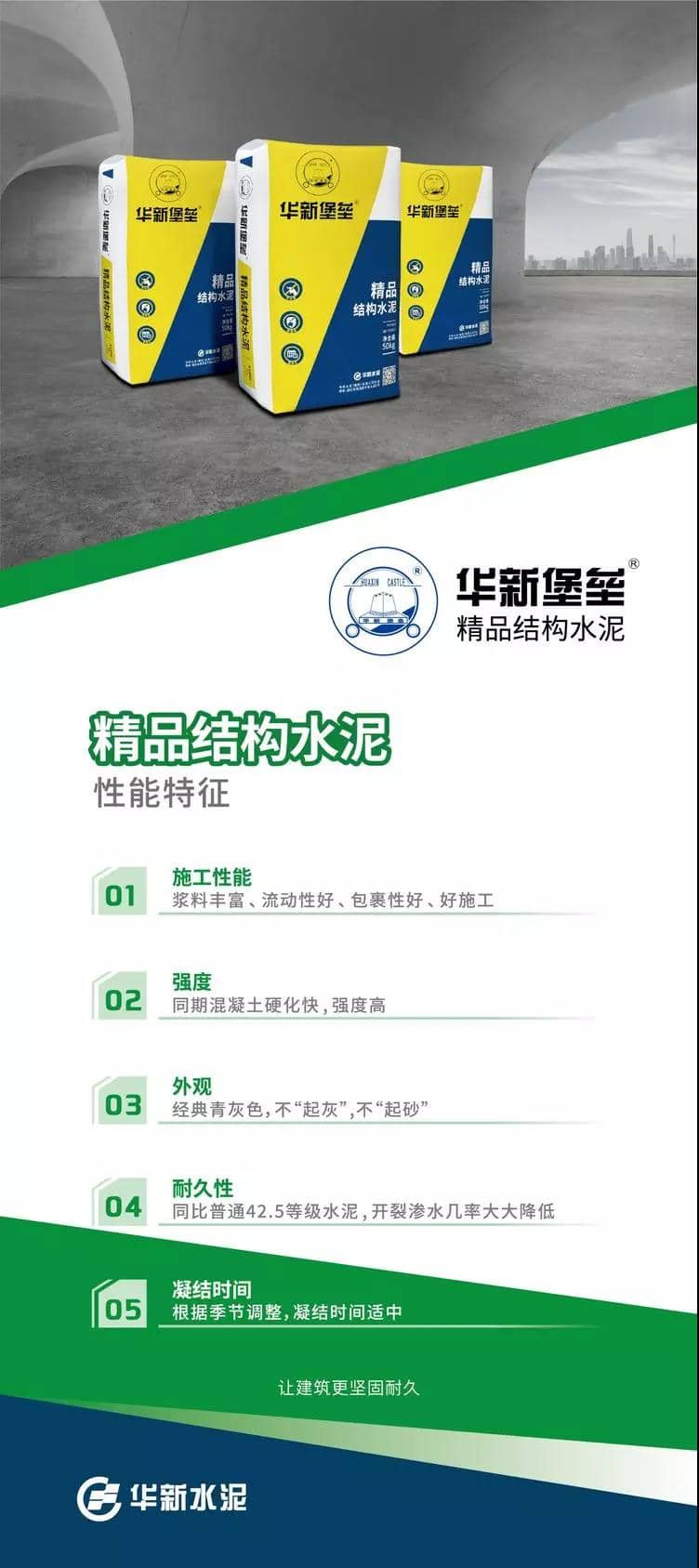P·C42.5精品結(jié)構(gòu)水泥是華新水泥取消P·C32.5R水泥為契機,通過公司專業(yè)研發(fā)團隊在進行了大量、充分的市場調(diào)研基礎(chǔ)上,針對私人建房、建筑結(jié)構(gòu)、基礎(chǔ)設(shè)施、一般工程、預(yù)制構(gòu)件、構(gòu)筑物等強度等級要求較高的混凝土工程施工需求在現(xiàn)有品類中分化出“結(jié)構(gòu)”水泥新品類。
