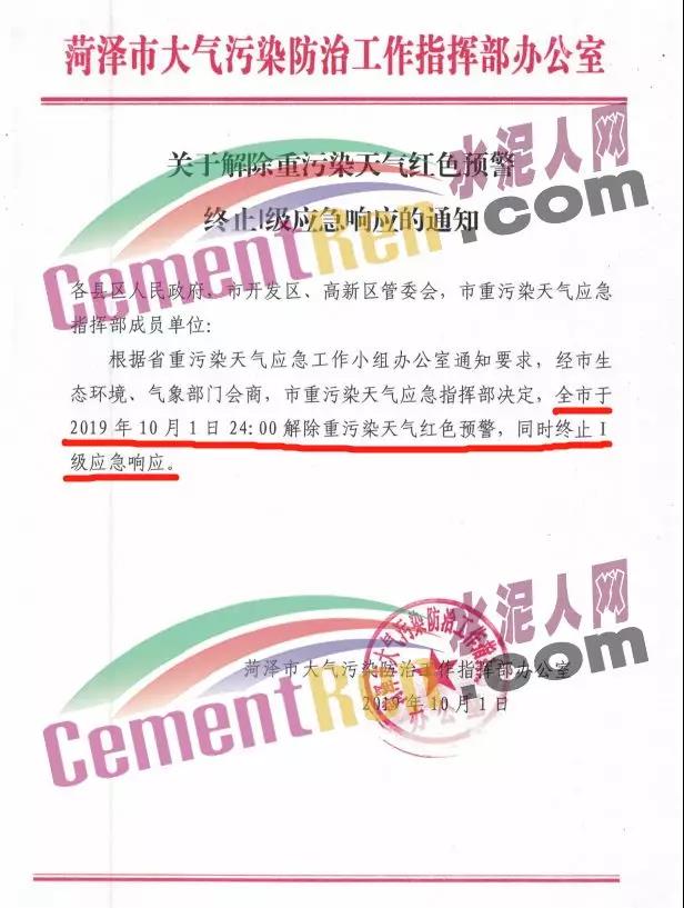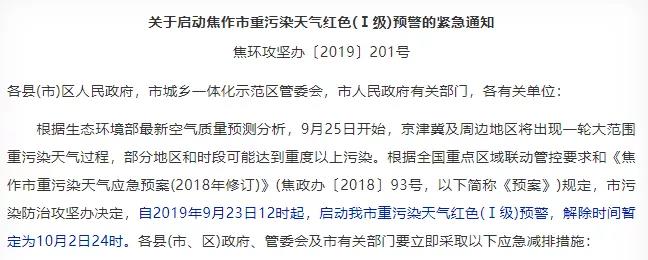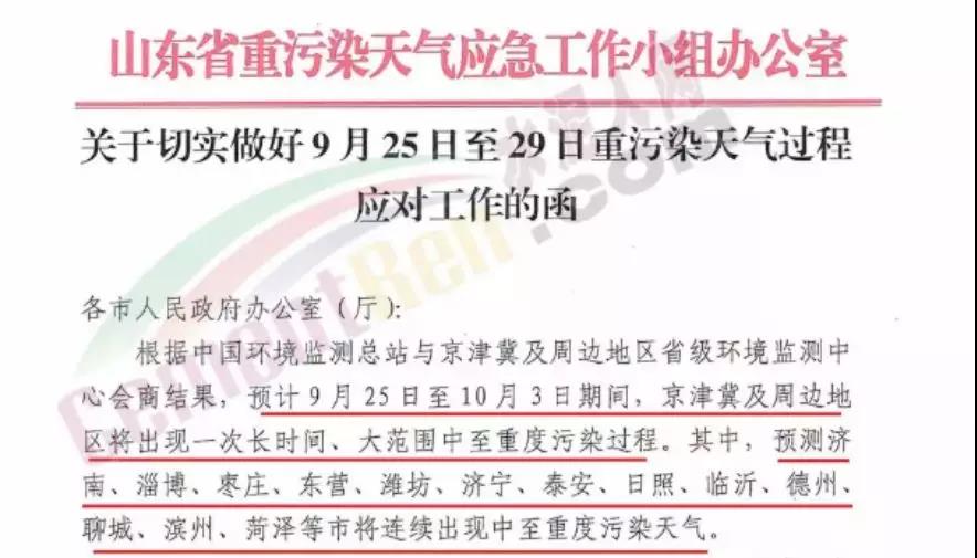 鄭州:自9月24日0時(shí)至10月2日24時(shí)啟動(dòng)重污染天氣II級(jí)應(yīng)急響應(yīng); 焦作:自9月23日12時(shí)起,啟動(dòng)重污染天氣紅色(Ⅰ級(jí))預(yù)警,解除時(shí)間暫定為10月2日24時(shí)?! 〕綎|省菏澤市之外,山東省濟(jì)南、淄博、棗莊、東莞、濰坊、濟(jì)寧、泰安、日照、臨沂、德州、聊城、濱州、菏澤等市也將于10月3日解除重污染天氣預(yù)警,各大工地、企業(yè)也將陸續(xù)復(fù)產(chǎn)。