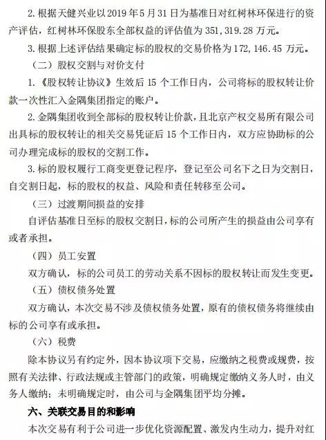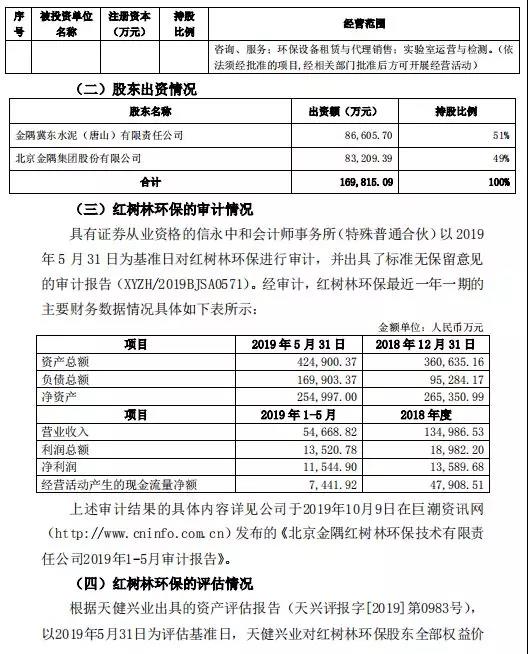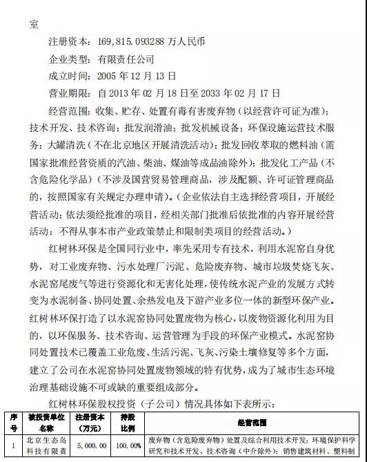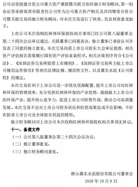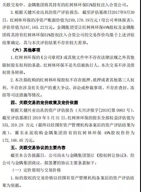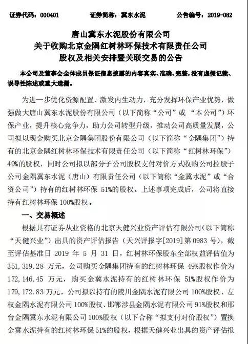 冀東水泥公告,擬現(xiàn)金收購(gòu)金隅集團(tuán)持有的紅樹林環(huán)保49%股權(quán),同時(shí)擬以部分子公司股權(quán)支付對(duì)價(jià)方式收購(gòu)控股子公司金冀水泥持有的紅樹林環(huán)保51%股權(quán)。交易完成后,冀東水泥將直接持有紅樹林環(huán)保100%股權(quán)。公告全文如下: