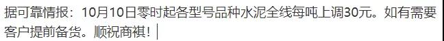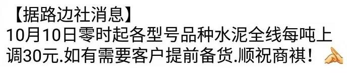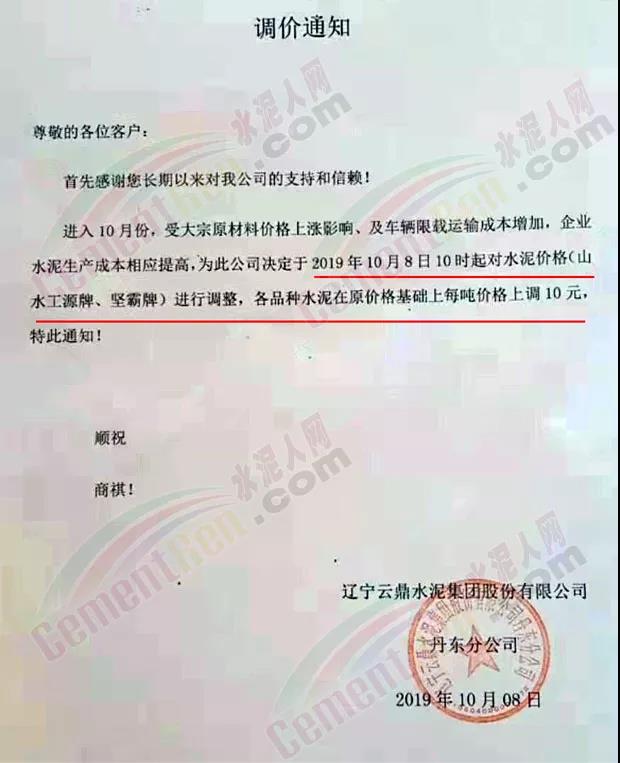 同日,位于東北遼寧的云鼎水泥集團(tuán)也發(fā)布了調(diào)價(jià)通知。云鼎集團(tuán)調(diào)價(jià)通知稱,進(jìn)入10月份,受大宗原材料價(jià)格上漲影響及車輛限載運(yùn)輸成本增加,企業(yè)水泥生產(chǎn)成本相應(yīng)提高,為此公司決定于10月8日10時(shí)起對(duì)水泥價(jià)格(山水工源牌、堅(jiān)霸牌)進(jìn)行調(diào)整,各品種水泥價(jià)格在原價(jià)格基礎(chǔ)上每噸上調(diào)10元。