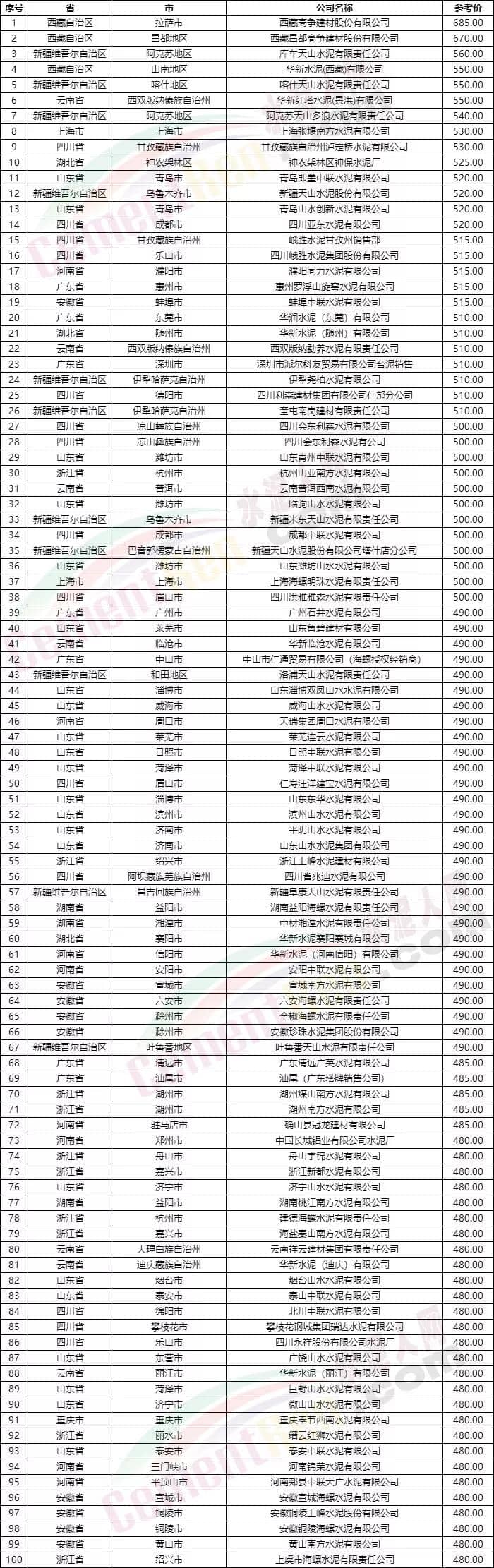 九月底華南廣東省粵東區(qū)域漲價(jià)落實(shí)后,粵西區(qū)域主導(dǎo)企業(yè)中材水泥、海螺水泥、華潤(rùn)水泥等陸續(xù)通知各標(biāo)號(hào)水泥在原執(zhí)行價(jià)格基礎(chǔ)上上調(diào)20元/噸。同期福建省全區(qū)域通知包散同漲20元/噸。(相關(guān)鏈接:金九銀十名不虛傳!九月連十月,海螺、中材、華潤(rùn)等集體漲價(jià))十月初,重慶市部分區(qū)域通知十一期間加強(qiáng)道路運(yùn)輸安全管理,要求重型貨車(渣土車、水泥罐車、以及石子車等建材材料運(yùn)輸車輛停運(yùn),導(dǎo)致部分區(qū)域工地停地待料,材料價(jià)格出現(xiàn)小幅上調(diào)。據(jù)了解,國(guó)家統(tǒng)計(jì)局近期公布的2019年9月中旬流通領(lǐng)域重要生產(chǎn)資料市場(chǎng)價(jià)格變動(dòng)情況顯示,24個(gè)省(區(qū)、市)200多個(gè)交易市場(chǎng)的普通硅酸鹽水泥(P.O 42.5散裝)均價(jià)為434.1元/噸。水泥人網(wǎng)信息中心重點(diǎn)監(jiān)控的近千家水泥企業(yè)價(jià)格數(shù)據(jù)顯示,10月初有半數(shù)以上企業(yè)水泥出廠價(jià)格達(dá)到或超過(guò)了9月中旬市價(jià)。附:2019年10月初部分企業(yè)水泥價(jià)格一覽(PO42.5散)