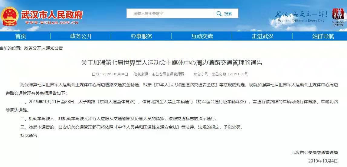2019年10月8日武漢市政府常務會議,審議了高排放非道路移動機械、城市軌道交通運營服務等工作。為了軍運會的正常開展,發(fā)布了軍運會期間交通管理措施:從10月15日0時起至10月28日24時,對貨車、?;愤\輸車、外埠機動車通行區(qū)域和通行時間做出相應限制。三環(huán)線區(qū)域內(含三環(huán)線)以及道路,全天禁止載貨汽車通行。