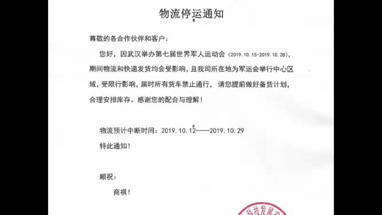 針對于軍運會的舉行,期間物流和快遞均會受到影響,屆時所有貨車禁止通行,請?zhí)崆白龊脗湄浻媱?,合理安排庫存。物流預計中斷時間:2019年10月12日至2019年10月29日。