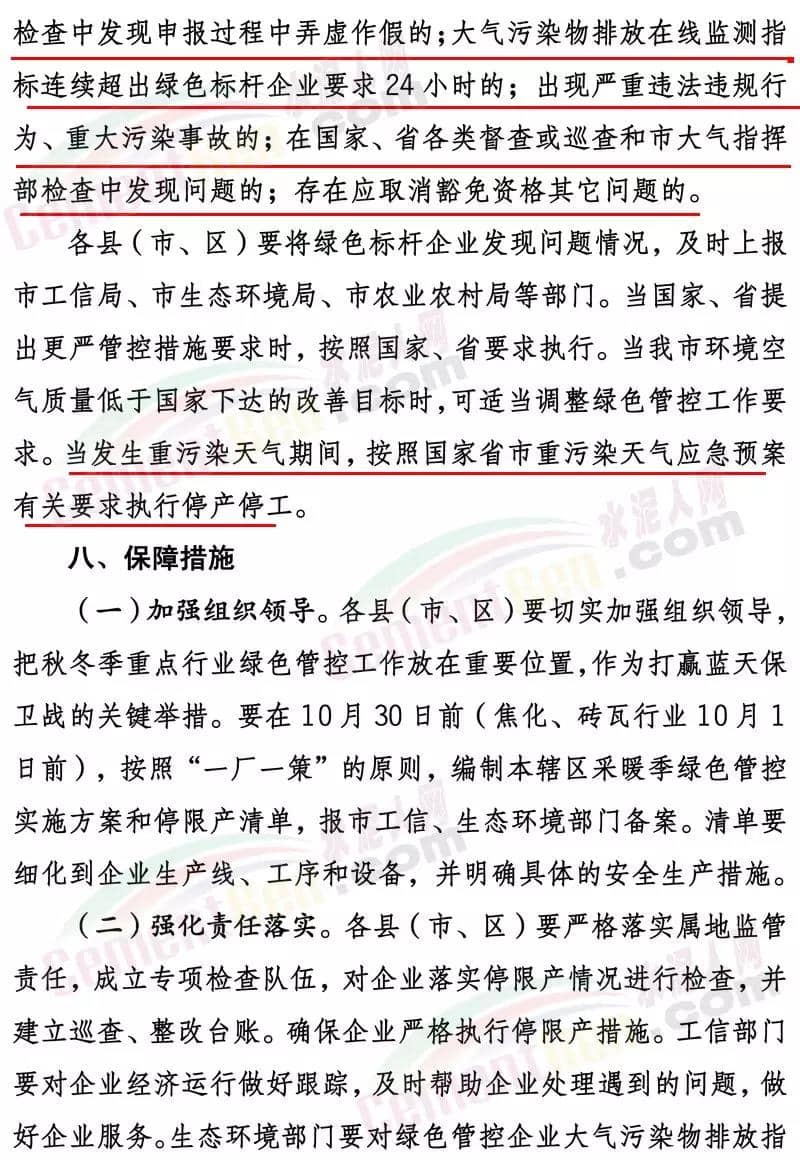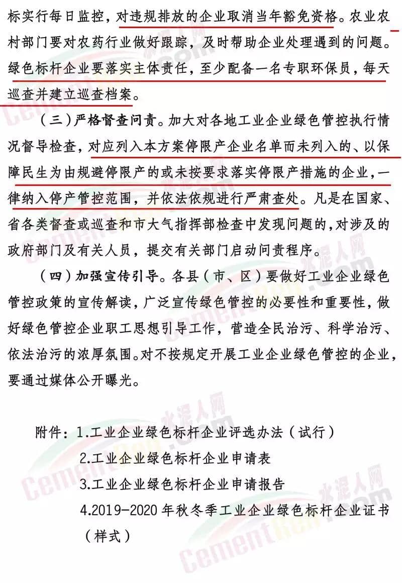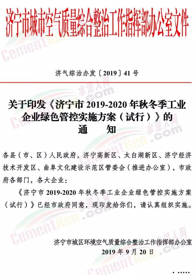 濟寧市2019-2020年秋冬季工業(yè)企業(yè)綠色管控實施方案(試行)文件要求工業(yè)企業(yè)秋冬季綠色管控實施時間原則上為秋冬季2019年10月1日至2020年3月31日。根據(jù)秋冬季空氣質(zhì)量改善目標和秋冬季重污染天氣預測情況,可適當縮短或延長各行業(yè)綠色管控實施時間。其中建材行業(yè)水泥(含粉磨站)、陶瓷、石灰、磚瓦、玻璃棉、石膏板、巖棉、礦物棉等,實施輪流停產(chǎn); 總體要求(一)實行綠色管控豁免政策。為避免“一刀切”,對行業(yè)污染排放績效水平明顯好于同行業(yè)其他企業(yè)的綠色標桿企業(yè),實行豁免,在2019-2020年秋冬季期間可以不停限產(chǎn)、少停限產(chǎn)。享受豁免政策的綠色標桿企業(yè)應經(jīng)批準后,向社會公開。對于享受豁免政策期間出現(xiàn)嚴重違法違規(guī)行為、重大污染事故等不符合豁免要求的,取消其豁免資格。(二)嚴格落實停限產(chǎn)措施。對于不符合豁免要求的企業(yè),應按照國家、省、市秋冬季大氣污染綜合治理攻堅行動方案和綠色管控方案規(guī)定,嚴格落實停限產(chǎn)的時間和比例。對于環(huán)保手續(xù)不全、各類污染物不能穩(wěn)定達標排放、監(jiān)測數(shù)據(jù)造假、涉嫌偷排偷放、未按期完成2019-2020年秋冬季大氣污染綜合治理改造任務的企業(yè),實施停產(chǎn)整治。對屬于《產(chǎn)業(yè)結(jié)構(gòu)調(diào)整指導目錄》限制類的,提高限產(chǎn)比例或?qū)嵤┩.a(chǎn)。(三)優(yōu)先突出民生保障。對于應停限產(chǎn)企業(yè)若涉及供暖、協(xié)同處置城市垃圾或危險廢物、保障城市正常運轉(zhuǎn)或涉及國家戰(zhàn)略性產(chǎn)業(yè)的工業(yè)企業(yè)和重大工程項目等保民生任務的,應優(yōu)先保障基本民生需求,在滿足保障任務的同時,根據(jù)其承擔的協(xié)同處置量和供暖面積等參數(shù)核定最大允許生產(chǎn)負荷科學制定減排措施。對因保民生任務的,報縣級人民政府批準,并由相關部門按有關要求報上級部門備案。(四)嚴格落實限產(chǎn)比例。對于采用限產(chǎn)方式的企業(yè),要嚴格限產(chǎn)比例,限產(chǎn)比例應當優(yōu)先采取生產(chǎn)線或生產(chǎn)工序停產(chǎn)方式達到,限產(chǎn)比例原則上以2019年4至10月期間企業(yè)正常生產(chǎn)(指生產(chǎn)負荷在75%以上)的平均產(chǎn)量為基準核算。對確實無法停產(chǎn)的生產(chǎn)線或生產(chǎn)設備,或因保民生任務不能完全停產(chǎn)的,應當以企業(yè)產(chǎn)品產(chǎn)量或用電量計限產(chǎn)負荷。(五)鼓勵優(yōu)秀企業(yè)發(fā)展。凡列入工信部綠色工廠或我市“510”企業(yè)培育工程名單的企業(yè),在穩(wěn)定達標排放的前提下,以相應要求為基礎,可享受不高于25%優(yōu)惠政策。動態(tài)管控對行業(yè)污染排放績效水平明顯好于同行業(yè)其他企業(yè)的工業(yè)企業(yè),按照《工業(yè)企業(yè)綠色標桿企業(yè)評選辦法(試行)》申請綠色標桿企業(yè),經(jīng)屬地政府批準后發(fā)放綠色標桿企業(yè)證書,可按規(guī)定實行不限產(chǎn)或少限產(chǎn)。建材(水泥熟料、粉磨站、陶瓷、磚瓦、石灰、玻璃棉、石膏板、巖棉、礦物棉)、焦化、鑄造、玻璃、炭素、各類鍋爐、涉VOCs等行業(yè)所有企業(yè)要全部納入管控清單,凡是未納入的,采暖季期間按同行業(yè)最嚴標準執(zhí)行停限產(chǎn)。綠色管控清單實行動態(tài)管控,通過治理符合條件的動態(tài)納入,不符合要求的動態(tài)剔除,及時報市工信局、市生態(tài)環(huán)境局、市農(nóng)業(yè)農(nóng)村局備案。對發(fā)生以下問題的,立即取消當年豁免資格:對檢查中發(fā)現(xiàn)申報過程中弄虛作假的;大氣污染物排放在線監(jiān)測指標連續(xù)超出綠色標桿企業(yè)要求24小時的;出現(xiàn)嚴重違法違規(guī)行為、重大污染事故的;在國家、省各類督查或巡查和市大氣指揮部檢查中發(fā)現(xiàn)問題的;存在應取消豁免資格其它問題的。各縣(市、區(qū))要將綠色標桿企業(yè)發(fā)現(xiàn)問題情況,及時上報市工信局、市生態(tài)環(huán)境局、市農(nóng)業(yè)農(nóng)村局等部門。當國家、省提出更嚴管控措施要求時,按照國家、省要求執(zhí)行。當我市環(huán)境空氣質(zhì)量低于國家下達的改善目標時,可適當調(diào)整綠色管控工作要求。當發(fā)生重污染天氣期間,按照國家省市重污染天氣應急預案有關要求執(zhí)行停產(chǎn)停工。強化責任落實。各縣(市、區(qū))要嚴格落實屬地監(jiān)管責任,成立專項檢查隊伍,對企業(yè)落實停限產(chǎn)情況進行檢查,并建立巡查、整改臺賬。確保企業(yè)嚴格執(zhí)行停限產(chǎn)措施。工信部門要對企業(yè)經(jīng)濟運行做好跟蹤,及時幫助企業(yè)處理遇到的問題,做好企業(yè)服務。生態(tài)環(huán)境部門要對綠色管控企業(yè)大氣污染物排放指標實行每日監(jiān)控,對違規(guī)排放的企業(yè)取消當年豁免資格。農(nóng)業(yè)農(nóng)村部門要對農(nóng)藥行業(yè)做好跟蹤,及時幫助企業(yè)處理遇到的問題。綠色標桿企業(yè)要落實主體責任,至少配備一名專職環(huán)保員,每天巡查并建立巡查檔案。嚴格督查問責。加大對各地工業(yè)企業(yè)綠色管控執(zhí)行情況督導檢查,對應列入本方案停限產(chǎn)企業(yè)名單而未列入的、以保障民生為由規(guī)