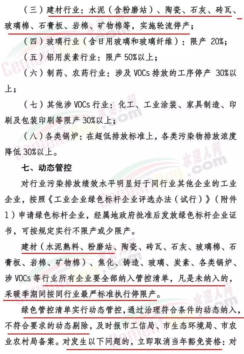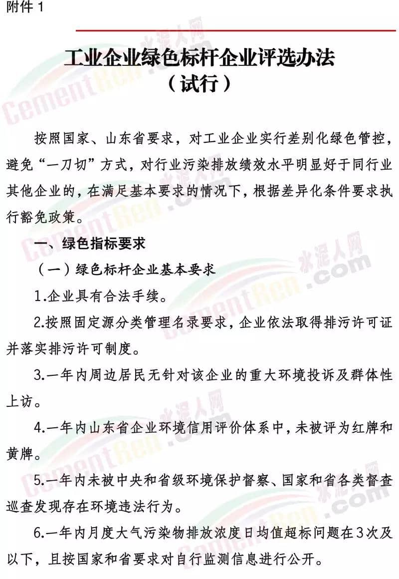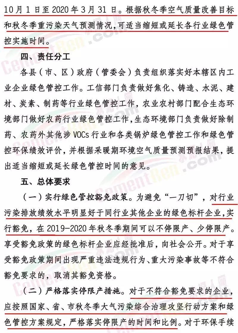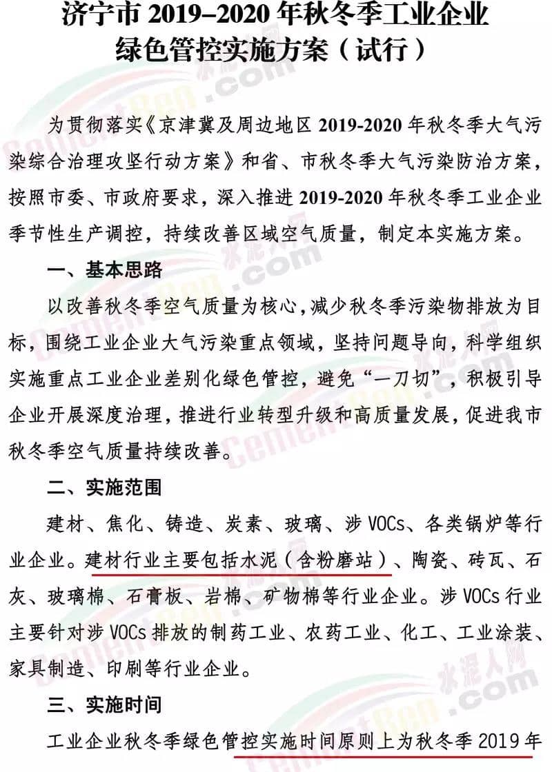 濟寧市2019-2020年秋冬季工業(yè)企業(yè)綠色管控實施方案(試行)文件要求工業(yè)企業(yè)秋冬季綠色管控實施時間原則上為秋冬季2019年10月1日至2020年3月31日。根據(jù)秋冬季空氣質(zhì)量改善目標和秋冬季重污染天氣預測情況,可適當縮短或延長各行業(yè)綠色管控實施時間。其中建材行業(yè)水泥(含粉磨站)、陶瓷、石灰、磚瓦、玻璃棉、石膏板、巖棉、礦物棉等,實施輪流停產(chǎn); 總體要求(一)實行綠色管控豁免政策。為避免“一刀切”,對行業(yè)污染排放績效水平明顯好于同行業(yè)其他企業(yè)的綠色標桿企業(yè),實行豁免,在2019-2020年秋冬季期間可以不停限產(chǎn)、少停限產(chǎn)。享受豁免政策的綠色標桿企業(yè)應經(jīng)批準后,向社會公開。對于享受豁免政策期間出現(xiàn)嚴重違法違規(guī)行為、重大污染事故等不符合豁免要求的,取消其豁免資格。(二)嚴格落實停限產(chǎn)措施。對于不符合豁免要求的企業(yè),應按照國家、省、市秋冬季大氣污染綜合治理攻堅行動方案和綠色管控方案規(guī)定,嚴格落實停限產(chǎn)的時間和比例。對于環(huán)保手續(xù)不全、各類污染物不能穩(wěn)定達標排放、監(jiān)測數(shù)據(jù)造假、涉嫌偷排偷放、未按期完成2019-2020年秋冬季大氣污染綜合治理改造任務的企業(yè),實施停產(chǎn)整治。對屬于《產(chǎn)業(yè)結(jié)構(gòu)調(diào)整指導目錄》限制類的,提高限產(chǎn)比例或?qū)嵤┩.a(chǎn)。(三)優(yōu)先突出民生保障。對于應停限產(chǎn)企業(yè)若涉及供暖、協(xié)同處置城市垃圾或危險廢物、保障城市正常運轉(zhuǎn)或涉及國家戰(zhàn)略性產(chǎn)業(yè)的工業(yè)企業(yè)和重大工程項目等保民生任務的,應優(yōu)先保障基本民生需求,在滿足保障任務的同時,根據(jù)其承擔的協(xié)同處置量和供暖面積等參數(shù)核定最大允許生產(chǎn)負荷科學制定減排措施。對因保民生任務的,報縣級人民政府批準,并由相關部門按有關要求報上級部門備案。(四)嚴格落實限產(chǎn)比例。對于采用限產(chǎn)方式的企業(yè),要嚴格限產(chǎn)比例,限產(chǎn)比例應當優(yōu)先采取生產(chǎn)線或生產(chǎn)工序停產(chǎn)方式達到,限產(chǎn)比例原則上以2019年4至10月期間企業(yè)正常生產(chǎn)(指生產(chǎn)負荷在75%以上)的平均產(chǎn)量為基準核算。對確實無法停產(chǎn)的生產(chǎn)線或生產(chǎn)設備,或因保民生任務不能完全停產(chǎn)的,應當以企業(yè)產(chǎn)品產(chǎn)量或用電量計限產(chǎn)負荷。(五)鼓勵優(yōu)秀企業(yè)發(fā)展。凡列入工信部綠色工廠或我市“510”企業(yè)培育工程名單的企業(yè),在穩(wěn)定達標排放的前提下,以相應要求為基礎,可享受不高于25%優(yōu)惠政策。動態(tài)管控對行業(yè)污染排放績效水平明顯好于同行業(yè)其他企業(yè)的工業(yè)企業(yè),按照《工業(yè)企業(yè)綠色標桿企業(yè)評選辦法(試行)》申請綠色標桿企業(yè),經(jīng)屬地政府批準后發(fā)放綠色標桿企業(yè)證書,可按規(guī)定實行不限產(chǎn)或少限產(chǎn)。建材(水泥熟料、粉磨站、陶瓷、磚瓦、石灰、玻璃棉、石膏板、巖棉、礦物棉)、焦化、鑄造、玻璃、炭素、各類鍋爐、涉VOCs等行業(yè)所有企業(yè)要全部納入管控清單,凡是未納入的,采暖季期間按同行業(yè)最嚴標準執(zhí)行停限產(chǎn)。綠色管控清單實行動態(tài)管控,通過治理符合條件的動態(tài)納入,不符合要求的動態(tài)剔除,及時報市工信局、市生態(tài)環(huán)境局、市農(nóng)業(yè)農(nóng)村局備案。對發(fā)生以下問題的,立即取消當年豁免資格:對檢查中發(fā)現(xiàn)申報過程中弄虛作假的;大氣污染物排放在線監(jiān)測指標連續(xù)超出綠色標桿企業(yè)要求24小時的;出現(xiàn)嚴重違法違規(guī)行為、重大污染事故的;在國家、省各類督查或巡查和市大氣指揮部檢查中發(fā)現(xiàn)問題的;存在應取消豁免資格其它問題的。各縣(市、區(qū))要將綠色標桿企業(yè)發(fā)現(xiàn)問題情況,及時上報市工信局、市生態(tài)環(huán)境局、市農(nóng)業(yè)農(nóng)村局等部門。當國家、省提出更嚴管控措施要求時,按照國家、省要求執(zhí)行。當我市環(huán)境空氣質(zhì)量低于國家下達的改善目標時,可適當調(diào)整綠色管控工作要求。當發(fā)生重污染天氣期間,按照國家省市重污染天氣應急預案有關要求執(zhí)行停產(chǎn)停工。強化責任落實。各縣(市、區(qū))要嚴格落實屬地監(jiān)管責任,成立專項檢查隊伍,對企業(yè)落實停限產(chǎn)情況進行檢查,并建立巡查、整改臺賬。確保企業(yè)嚴格執(zhí)行停限產(chǎn)措施。工信部門要對企業(yè)經(jīng)濟運行做好跟蹤,及時幫助企業(yè)處理遇到的問題,做好企業(yè)服務。生態(tài)環(huán)境部門要對綠色管控企業(yè)大氣污染物排放指標實行每日監(jiān)控,對違規(guī)排放的企業(yè)取消當年豁免資格。農(nóng)業(yè)農(nóng)村部門要對農(nóng)藥行業(yè)做好跟蹤,及時幫助企業(yè)處理遇到的問題。綠色標桿企業(yè)要落實主體責任,至少配備一名專職環(huán)保員,每天巡查并建立巡查檔案。嚴格督查問責。加大對各地工業(yè)企業(yè)綠色管控執(zhí)行情況督導檢查,對應列入本方案停限產(chǎn)企業(yè)名單而未列入的、以保障民生為由規(guī)