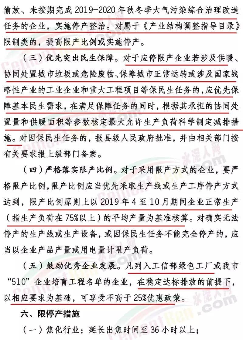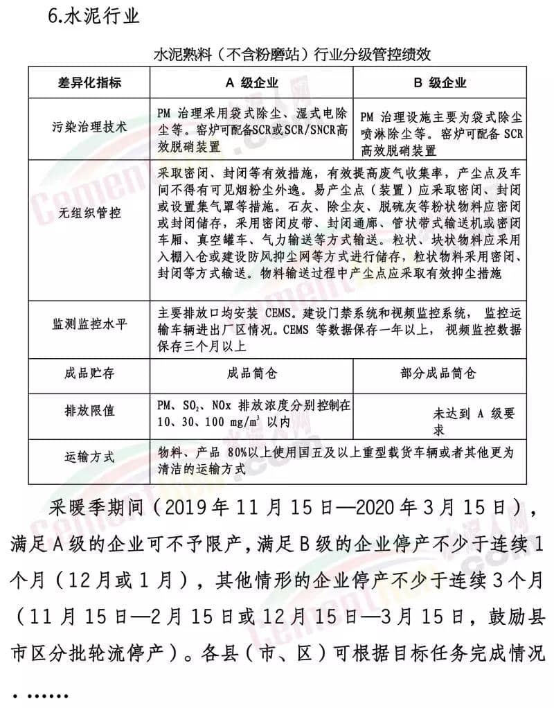采暖季期間(2019年11月15日—2020年3月15日),滿足A級的企業(yè)可不予限產(chǎn),滿足B級的企業(yè)停產(chǎn)不少于連續(xù)1個月(12月或1月),其他情形的企業(yè)停產(chǎn)不少于連續(xù)3個月(11月15日—2月15日或12月15日—3月15日,鼓勵縣市區(qū)分批輪流停產(chǎn))。各縣(市、區(qū))可根據(jù)目標任務完成情況和管理實際加嚴要求。如山東省水泥協(xié)會出臺更嚴停限產(chǎn)要求,從嚴執(zhí)行。采暖季期間(2019年11月15日—2020年3月15日),粉磨站停產(chǎn)不少于連續(xù)2個月(11月15日—1月15日或1月15日—3月15日,鼓勵縣市區(qū)分批輪流停產(chǎn))。各縣(市、區(qū))可根據(jù)目標任務完成情況和管理實際加嚴要求。如山東省水泥協(xié)會出臺更嚴停限產(chǎn)要求,從嚴執(zhí)行。