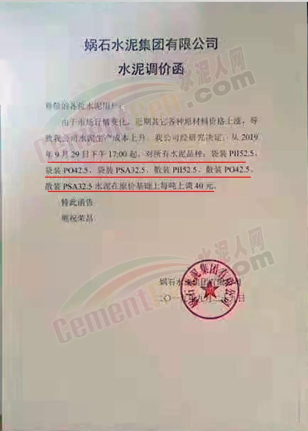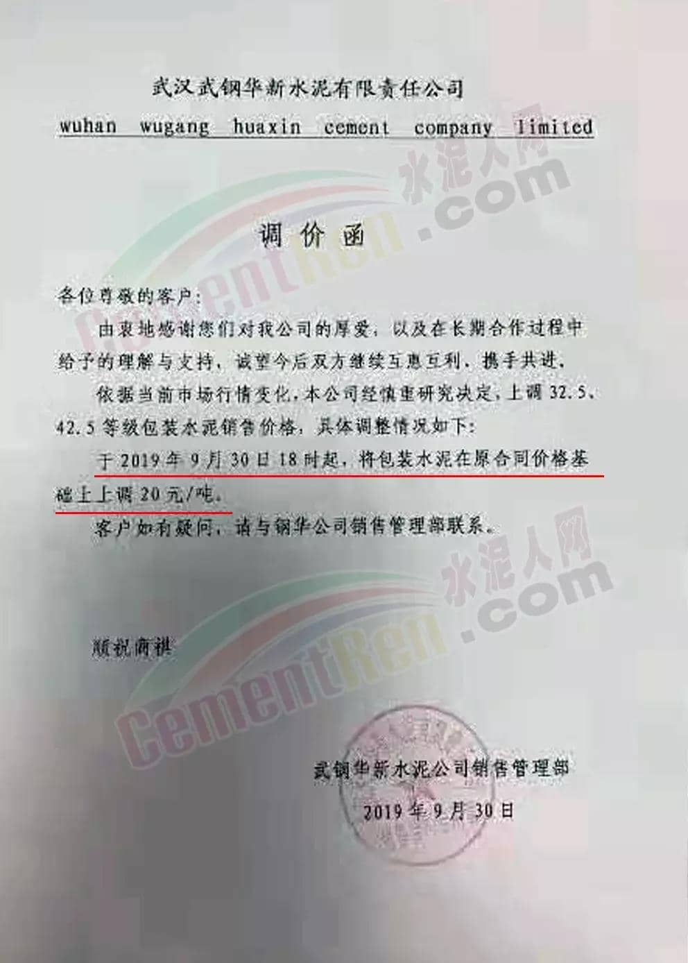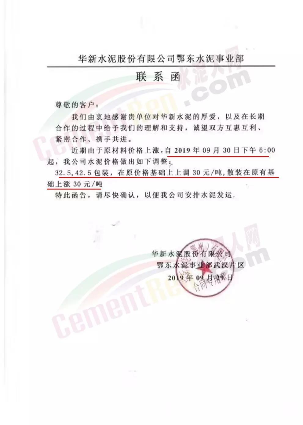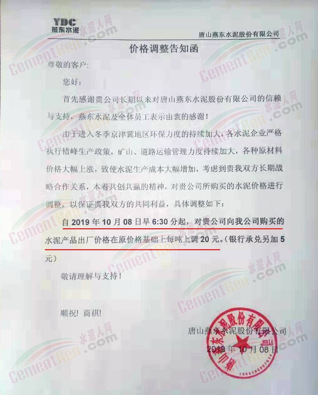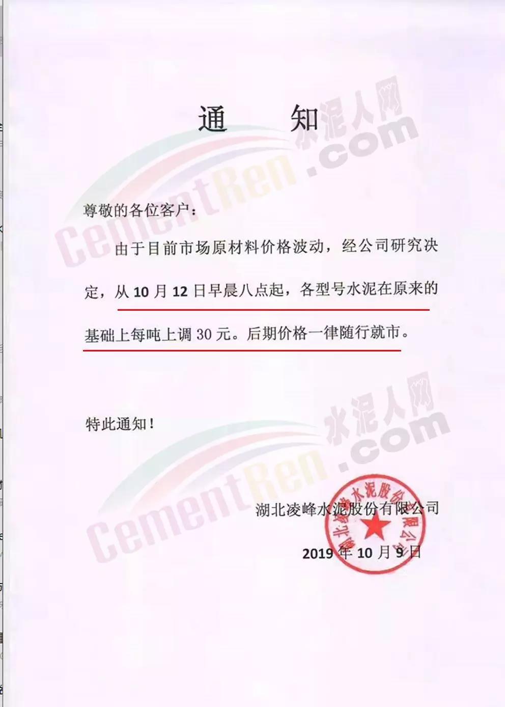 您好!感謝一直以來給予我公司的大力支持!因近期市場行情發(fā)生變化,為了公司的健康發(fā)展、保證產(chǎn)品和服務(wù)質(zhì)量,更好地加強(qiáng)貴我雙方的長期協(xié)作,經(jīng)我公司研究決定自2019年10月8日00:00時起,32.5R級別袋裝、散裝品種水泥出廠價(jià)在原基礎(chǔ)上上調(diào)30元/噸;42.5R級別袋裝、散裝品種水泥出廠價(jià)在原基礎(chǔ)上上調(diào)40元/噸;如您繼續(xù)安排車輛到我公司提貨,則視為您同意和確認(rèn)此次價(jià)格調(diào)整,不便之處,敬請理解順頌商祺!
