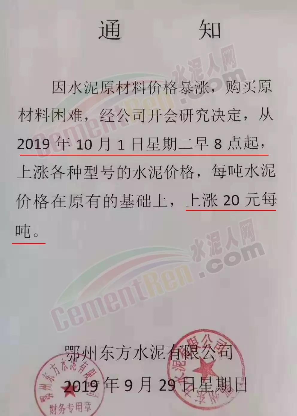 日前,江西尋烏南方萬年青水泥有限公司發(fā)通知給廣東區(qū)域客戶稱:因近期市場行情發(fā)生變化,公司研究決定自2019年10月8日00:00時起,32.5R級別袋裝、散裝品種水泥出廠價(jià)在原基礎(chǔ)上上調(diào)30元/噸;42.5R級別袋裝、散裝品種水泥出廠價(jià)在原基礎(chǔ)上上調(diào)40元/噸。