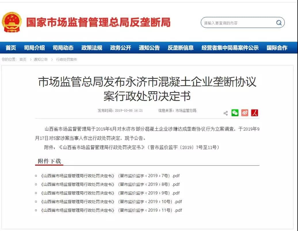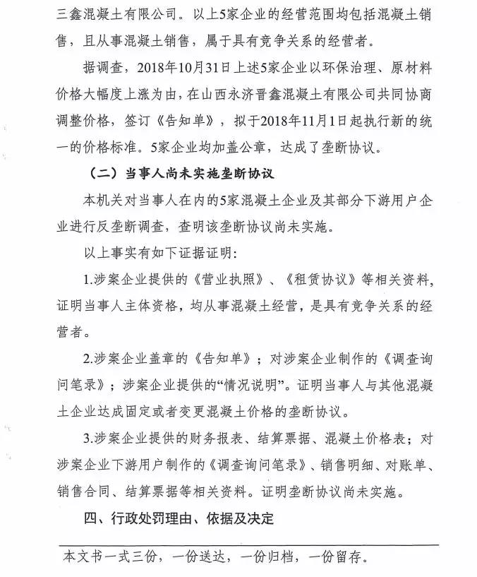 第7號處罰決定書提到根據(jù)群眾舉報,永濟市鑫力混凝土有限公司、永濟市寶寶混凝土有限公司、永濟市毅達混凝土有限公司、永濟市晉鑫混凝土有限、永濟市三鑫混凝土有限公司等五家企業(yè)于上年10月31日共同簽訂《商品混凝土調價告知單》約定于當年11月1日起執(zhí)行統(tǒng)一約定的價格,涉嫌壟斷。