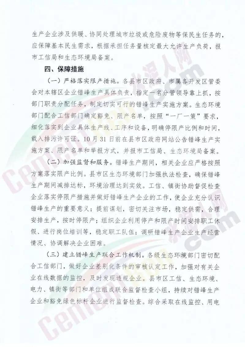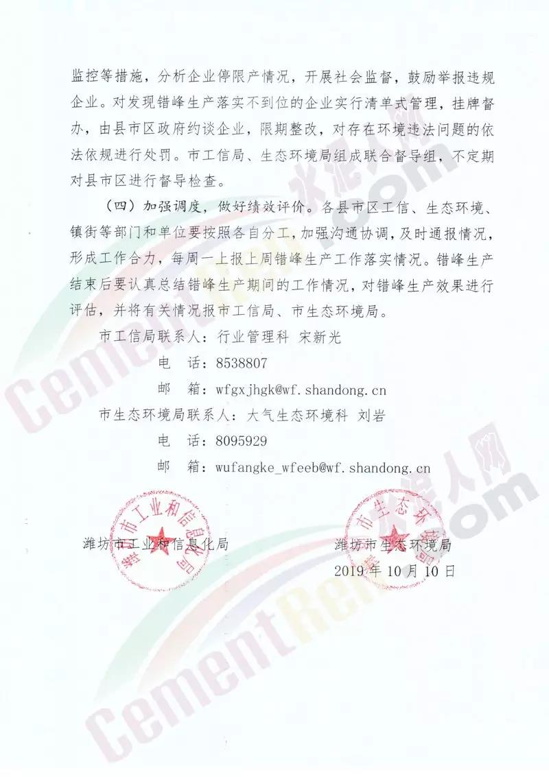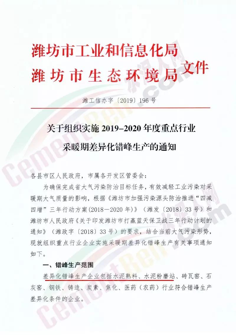 水泥人網(wǎng)消息:山東濰坊市工信局,維坊市生態(tài)環(huán)境局聯(lián)合發(fā)布《關(guān)于組織實(shí)施2019-2020年度重點(diǎn)行業(yè)采暖期差異化錯(cuò)峰生產(chǎn)的通知 》。通知稱:差異化錯(cuò)峰生產(chǎn)企業(yè)包括 水泥熟料、水泥粉磨站等。對(duì)行業(yè)污染排放績(jī)效水平明顯好于同行業(yè)其他 企業(yè)滿綠色標(biāo)桿企業(yè)條件的實(shí)施錯(cuò)峰生產(chǎn)豁免。對(duì)水泥企業(yè)熟料生產(chǎn)線實(shí)施停產(chǎn),水泥粉磨站限產(chǎn)50%。通知原文如下: