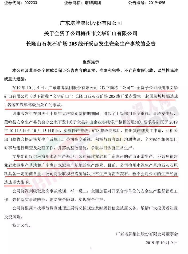 塔牌集團(002233)9日晚公告,10月5日,全資子公司文華礦山長隆山石灰石礦場205線開采點發(fā)生一起因邊坡垮塌造成1名運礦汽車駕駛員死亡的事故。文華礦山僅供應梅州水泥生產(chǎn)基地,公司福建龍巖和廣東惠州的礦山正常生產(chǎn),不影響福建龍巖水泥生產(chǎn)基地和廣東惠州水泥生產(chǎn)基地的生產(chǎn)經(jīng)營。目前,公司梅州水泥生產(chǎn)基地石灰石原料具備一定的儲備量,公司將采取積極措施解決正常生產(chǎn)所需石灰石。