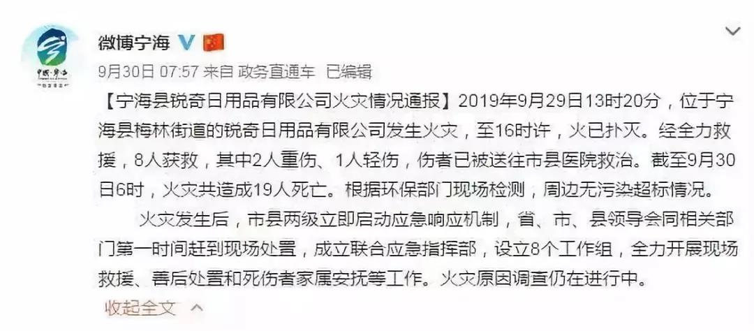 9月30日7時57分,寧??h委相關(guān)部門發(fā)布通告,稱在此次火災(zāi)中,經(jīng)全力救援,8人獲救,其中2人重傷、1人輕傷,傷者已被送往市縣醫(yī)院救治。截至9月30日6時,火災(zāi)共造成19人死亡。