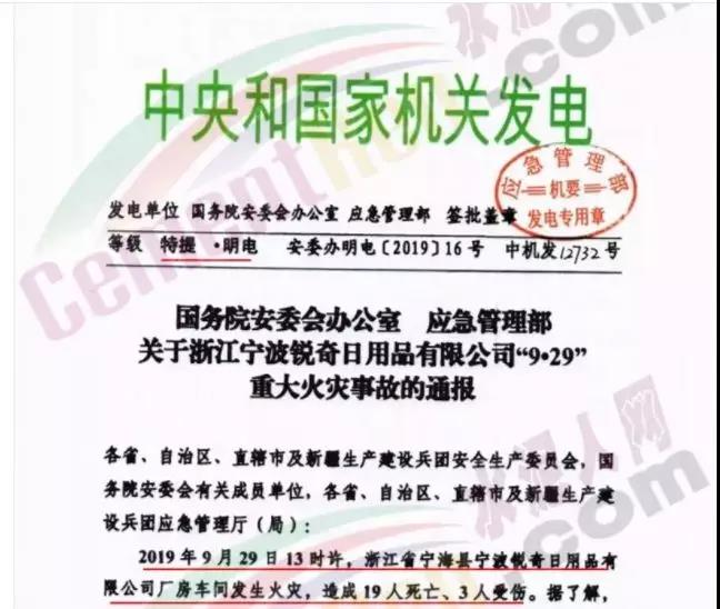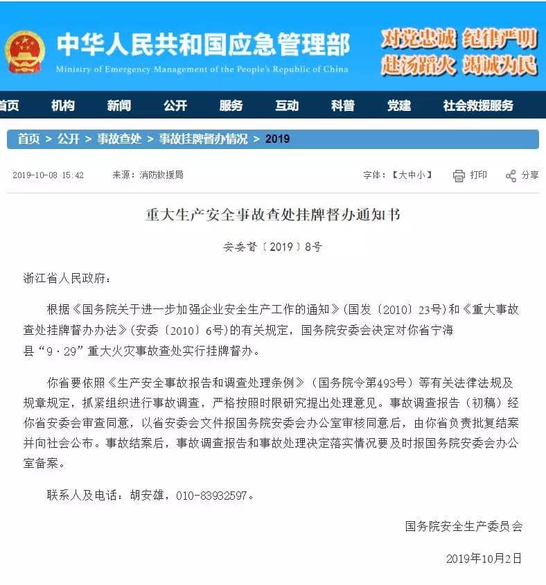 10月8日國家應(yīng)急管理部官網(wǎng)發(fā)布來自于消防救援局的《重大生產(chǎn)安全事故查處掛牌督辦通知書》(安委督﹝2019﹞8號)提到根據(jù)《國務(wù)院關(guān)于進一步加強企業(yè)安全生產(chǎn)工作的通知》(國發(fā)﹝2010﹞23號)和《重大事故查處掛牌督辦辦法》(安委﹝2010﹞6號)的有關(guān)規(guī)定,國務(wù)院安委會決定對浙江省寧波市寧海縣“9·29”重大火災(zāi)事故查處實行掛牌督辦。通知要求浙江省依照《生產(chǎn)安全事故報告和調(diào)查處理條例》(國務(wù)院令第493號)等有關(guān)法律法規(guī)及規(guī)章規(guī)定,抓緊組織進行事故調(diào)查,嚴格按照時限研究提出處理意見。
