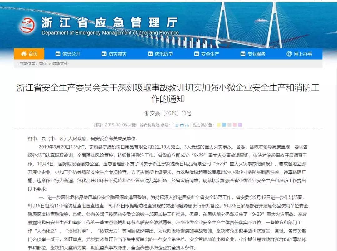 10月6日,浙江省應(yīng)急管理廳發(fā)布了《浙江省安全生產(chǎn)委員會關(guān)于深刻吸取事故教訓切實加強小微企業(yè)安全生產(chǎn)和消防工作的通知》,稱省政府立即成立了“9•29”重大火災(zāi)事故調(diào)查組,對該起事故開展調(diào)查工作,并要求各級各部門認真吸取教訓,全面落實風險管控,持續(xù)推進整治工作。
