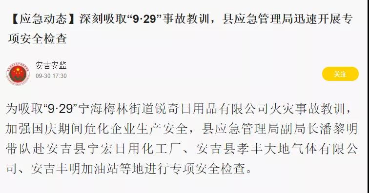 事故發(fā)生后,浙江省湖州市安吉縣應(yīng)急管理局深刻吸取“9.29”事故教訓,迅速開展了專項安全檢查。由縣應(yīng)急管理局副局長親自帶隊趕區(qū)域內(nèi)相關(guān)企業(yè)進行專項安全檢查。