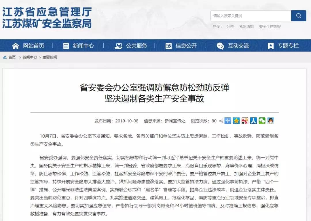 10月7日10月7日,江蘇省安委會辦公室下發(fā)通知,要求各地、各有關(guān)部門和單位堅決防止思想懈怠、工作松勁、事故反彈,防范遏制各類生產(chǎn)安全事故。