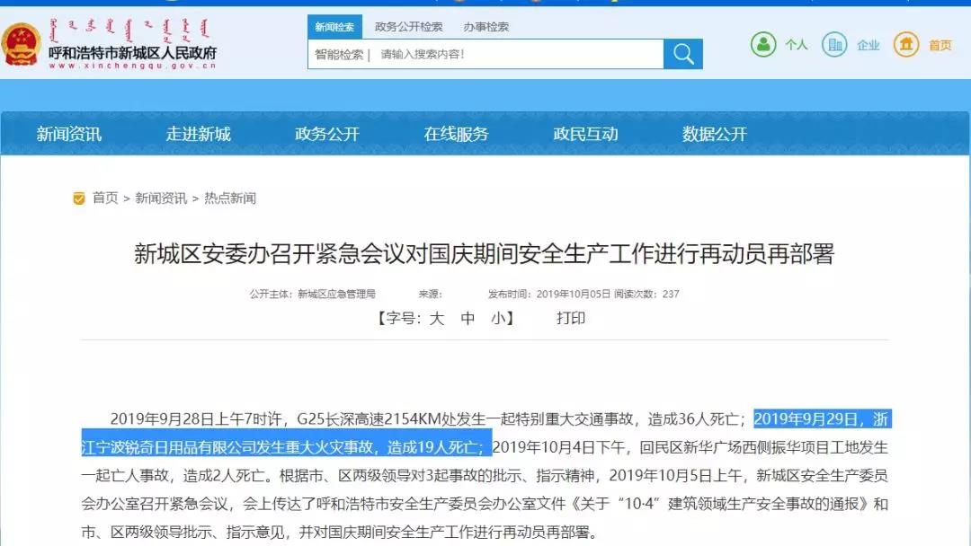 10月5日內(nèi)蒙古呼和浩特市新城區(qū)人民政府轉(zhuǎn)發(fā)新城區(qū)應(yīng)急管理部消息稱,2019年9月28日上午7時許,G25長深高速2154KM處發(fā)生一起特別重大交通事故,造成36人死亡;2019年9月29日,浙江寧波銳奇日用品有限公司發(fā)生重大火災(zāi)事故,造成19人死亡;2019年10月4日下午,回民區(qū)新華廣場西側(cè)振華項目工地發(fā)生一起亡人事故,造成2人死亡。根據(jù)市、區(qū)兩級領(lǐng)導對3起事故的批示、指示精神,2019年10月5日上午,新城區(qū)安全生產(chǎn)委員會辦公室召開緊急會議,會上傳達了呼和浩特市安全生產(chǎn)委員會辦公室文件《關(guān)于“10·4”建筑領(lǐng)域生產(chǎn)安全事故的通報》和市、區(qū)兩級領(lǐng)導批示、指示意見,并對十一期間安全生產(chǎn)工作進行再動員再部署。