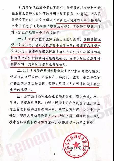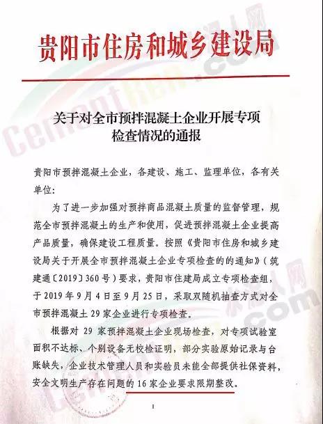 貴陽市預(yù)拌混凝土企業(yè),各建設(shè)、施工、監(jiān)理單位,各有關(guān)單位: 為了進(jìn)一步加強(qiáng)對預(yù)拌商品混凝土質(zhì)量的監(jiān)督管理,規(guī)范全市預(yù)拌混凝土的生產(chǎn)和使用,促進(jìn)預(yù)拌混凝土企業(yè)提高產(chǎn)品質(zhì)量,確保建設(shè)工程質(zhì)量。按照《貴陽市住房和城鄉(xiāng)建設(shè)局關(guān)于開展全市預(yù)拌混凝土企業(yè)專項(xiàng)檢查的通知》(筑建通〔2019〕360號(hào))要求,貴陽市住建局成立專項(xiàng)檢查組,于2019年9月4曰至9月25曰,采取雙隨機(jī)抽査方式對全市預(yù)拌混凝土29家企業(yè)進(jìn)行專項(xiàng)檢査。 根據(jù)對29家預(yù)拌混凝土企業(yè)現(xiàn)場檢査,對專項(xiàng)試驗(yàn)室 面積不達(dá)標(biāo),個(gè)別設(shè)備無校檢證明,部分實(shí)驗(yàn)原始記錄與合賬缺失,企業(yè)技術(shù)管理人員和實(shí)驗(yàn)資未能全部提供社保資料, 安全文明生產(chǎn)存在問題的16家企業(yè)要求限期整改。 針對專項(xiàng)試驗(yàn)室不能正常運(yùn)行、質(zhì)量技術(shù)檔案資料欠缺、 企業(yè)技術(shù)管理人員和實(shí)驗(yàn)員到崗履職較差、對混凝土產(chǎn)品質(zhì)量管控不到位、安全文明生產(chǎn)存在較大問題的8家預(yù)拌混凝 土企業(yè)下達(dá)了《責(zé)令伴產(chǎn)整頓通知書》,責(zé)令停產(chǎn)整頓?,F(xiàn)對8家預(yù)拌混凝土企業(yè)通報(bào)如下: 一、8家停產(chǎn)整頓預(yù)拌混凝土企業(yè)分別是:貴陽昊恒混凝土有限公司;貴州大遠(yuǎn)混凝土有限公司;貴州商品混凝土有限公司;貴州開陽通筑混凝土有限公司;貴陽花溪貴和建材有限公司;貴陽潤達(dá)商砼有限公司;貴陽小河區(qū)鑫磊建材有限公司;貴州征途混凝土有限公司。 二、以上8家停產(chǎn)整頓預(yù)拌混凝土企業(yè)須認(rèn)真進(jìn)行整改, 經(jīng)復(fù)査符合要求后,方能生產(chǎn)。各建設(shè)、監(jiān)理,施工單位要嚴(yán)格落實(shí)施工現(xiàn)場監(jiān)管,暫停使用以上8家預(yù)拌混凝土企業(yè)生產(chǎn)的混凝土?! ∪?、全市預(yù)拌混凝土企業(yè)要高度重視,引以為戒,舉一 反三,提高質(zhì)量意識(shí),加強(qiáng)對混凝土的產(chǎn)品質(zhì)量管理,建立健全管理制度和質(zhì)量控制體系,落實(shí)文明生產(chǎn)、安全生產(chǎn)責(zé) 任制,管理人員必須配置齊全,持證上崗,明確職責(zé),做好技術(shù)資料收集和存檔管理工作,保證混凝土的產(chǎn)品質(zhì)量。