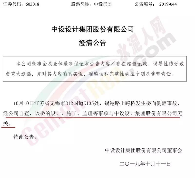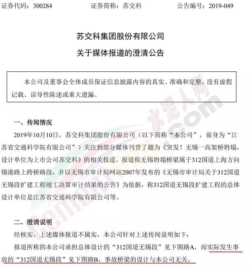 10月11日早間,該公司發(fā)公告稱(chēng),報(bào)道不屬實(shí),公司承擔(dān)總體設(shè)計(jì)的“312國(guó)道無(wú)錫段”并非事故路段,事故橋梁的設(shè)計(jì)與公司無(wú)關(guān)。