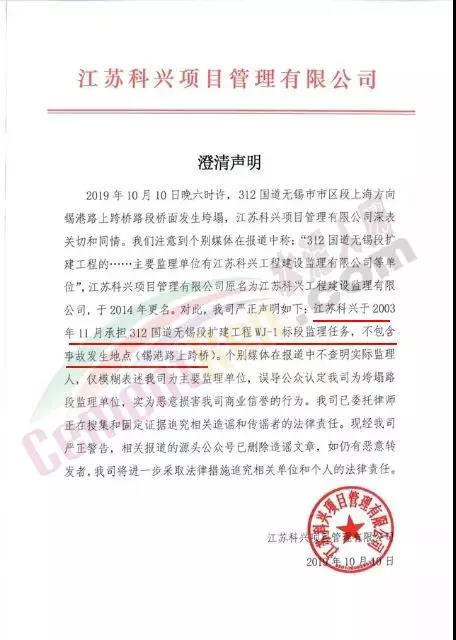 另一家名為江蘇科興項(xiàng)目管理有限公司的項(xiàng)目監(jiān)理公司也發(fā)布了類(lèi)似的澄清公告。稱(chēng)其承擔(dān)的312國(guó)道無(wú)錫段擴(kuò)建工程監(jiān)理任務(wù)中,不包括事故發(fā)生地 點(diǎn)(錫港路上跨橋)。