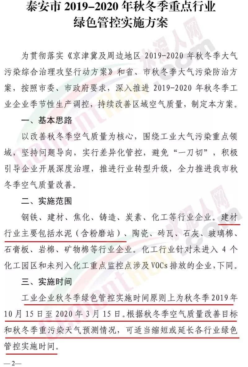 《泰安市2019-2020年秋冬季重點(diǎn)行業(yè)綠色管控實(shí)施方案》中提到,為貫徹落實(shí)《京津冀及周邊地區(qū) 2019-2020 年秋冬季大氣污染綜合治理攻堅(jiān)行動(dòng)方案》和省、市秋冬季大氣污染防治方案,按照泰安市市委、市政府要求,深入推進(jìn) 2019-2020 年秋冬季工業(yè)企業(yè)季節(jié)性生產(chǎn)調(diào)控,持續(xù)改善區(qū)域空氣質(zhì)量,制定此方案。管控實(shí)施范圍包括鋼鐵、建材、焦化、化工等行業(yè)企業(yè)。其中建材行業(yè)主要包括水泥(含粉磨站)、陶瓷、磚瓦、石灰等行業(yè)企業(yè)。實(shí)施時(shí)間為工業(yè)企業(yè)秋冬季綠色管控實(shí)施時(shí)間原則上為秋冬季2019年10 月 15 日至 2020 年 3 月 15 日。根據(jù)秋冬季空氣質(zhì)量改善目標(biāo)和秋冬季重污染天氣預(yù)測(cè)情況,可適當(dāng)縮短或延長(zhǎng)各行業(yè)綠色管控實(shí)施時(shí)間。