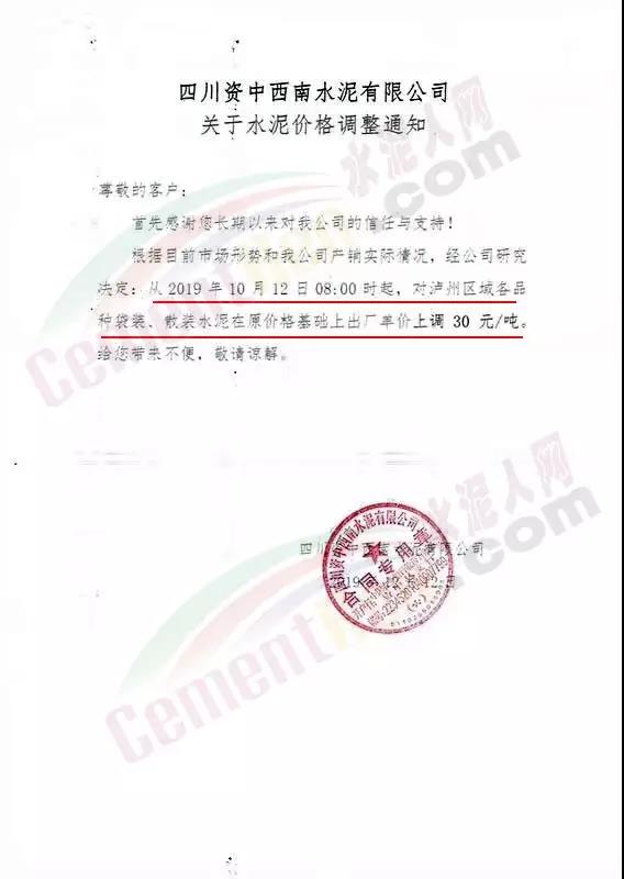 感謝您對我公司長期以來的信賴與支持,根據(jù)近期市場變化及公司產(chǎn)銷形勢,決定于2019年10月12日08:00起對所有區(qū)域袋裝、散裝水泥上調(diào)30元/噸。